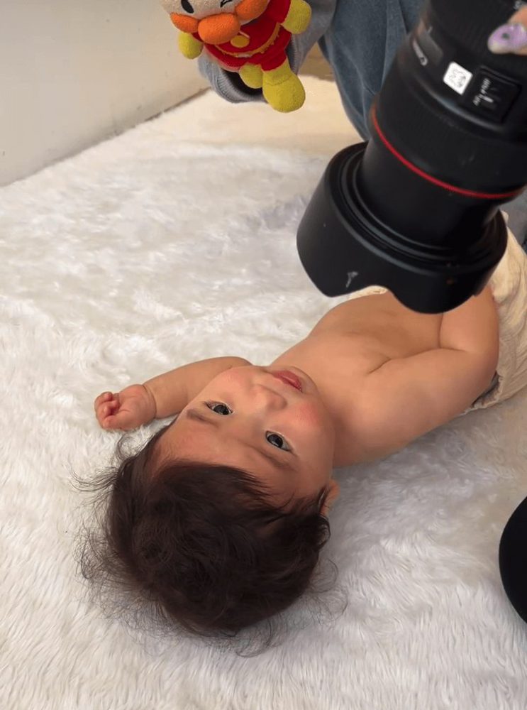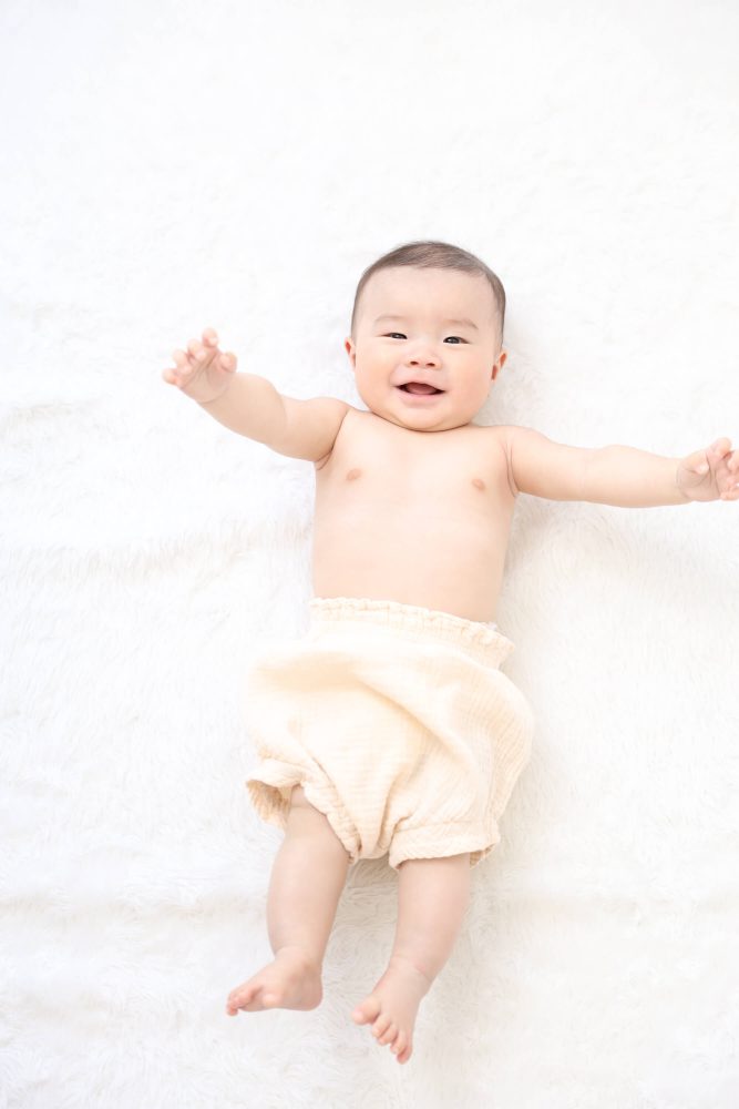 百日に近い赤ちゃんはゴロンで小さなあんよやおててを撮影。
