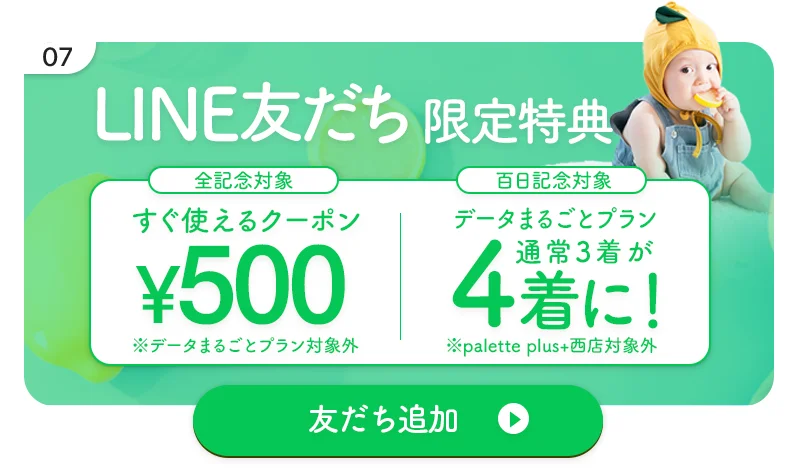 ⑦LINE友達限定特典で¥500OFFクーポン&百日さんのデータまるごとプランに1着プレゼント!