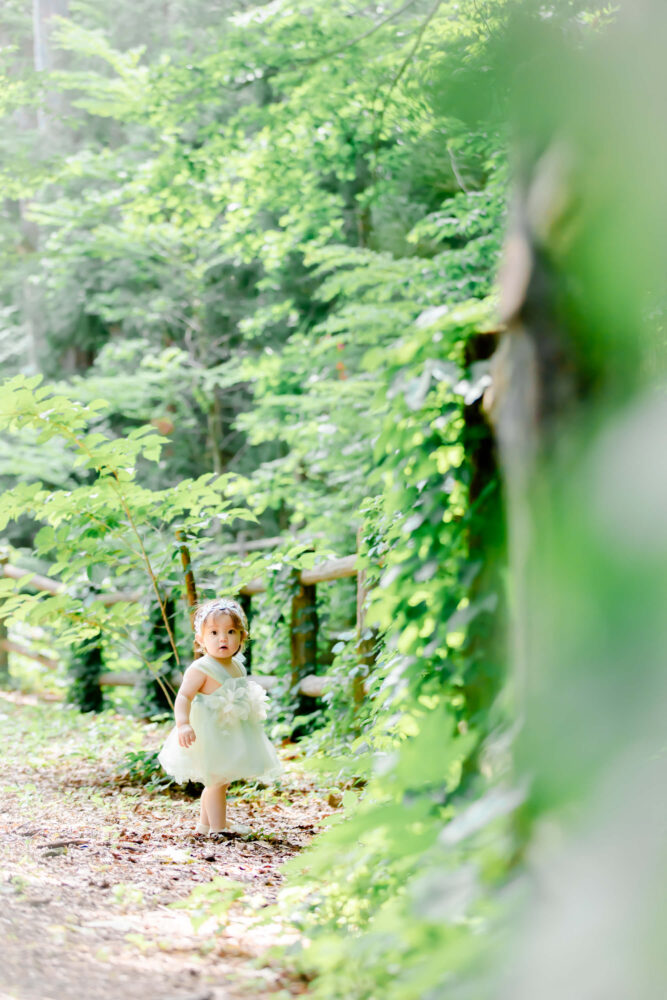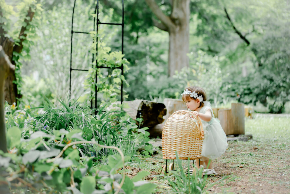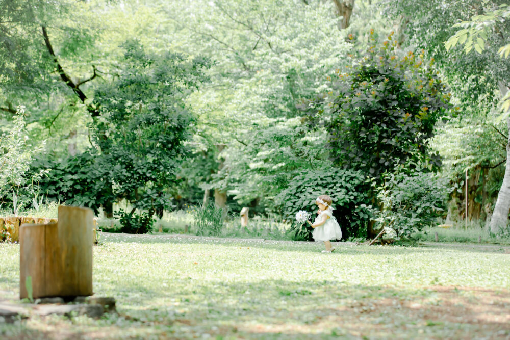 自然豊かな公園で、世界観に合わせたコーディネートで、まるで絵本の中の世界に入り込んだようです。