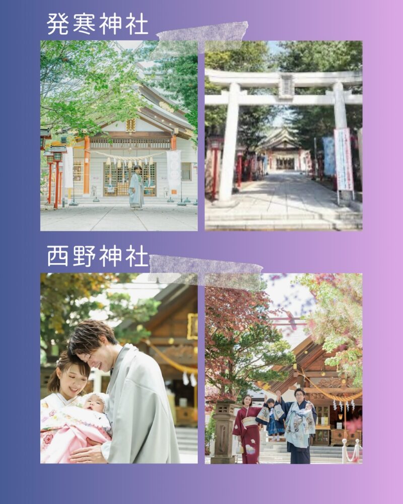 発寒神社は赤白の社殿に木々のグリーンのコントラストが美しく、お子様と御社全体を写真に収めやすいサイズの社殿。時期が合えば花手水やオリジナルのフォトスポットもある、幻想的でフオトジェニックな空間がここにしかない魅力です。