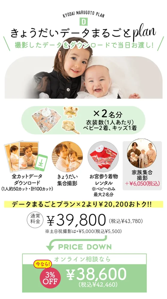 きょうだいデータまるごと plan39,800円(+税)で、撮影した約80〜100カットのデータを当日中にダウンロードいただけます 。