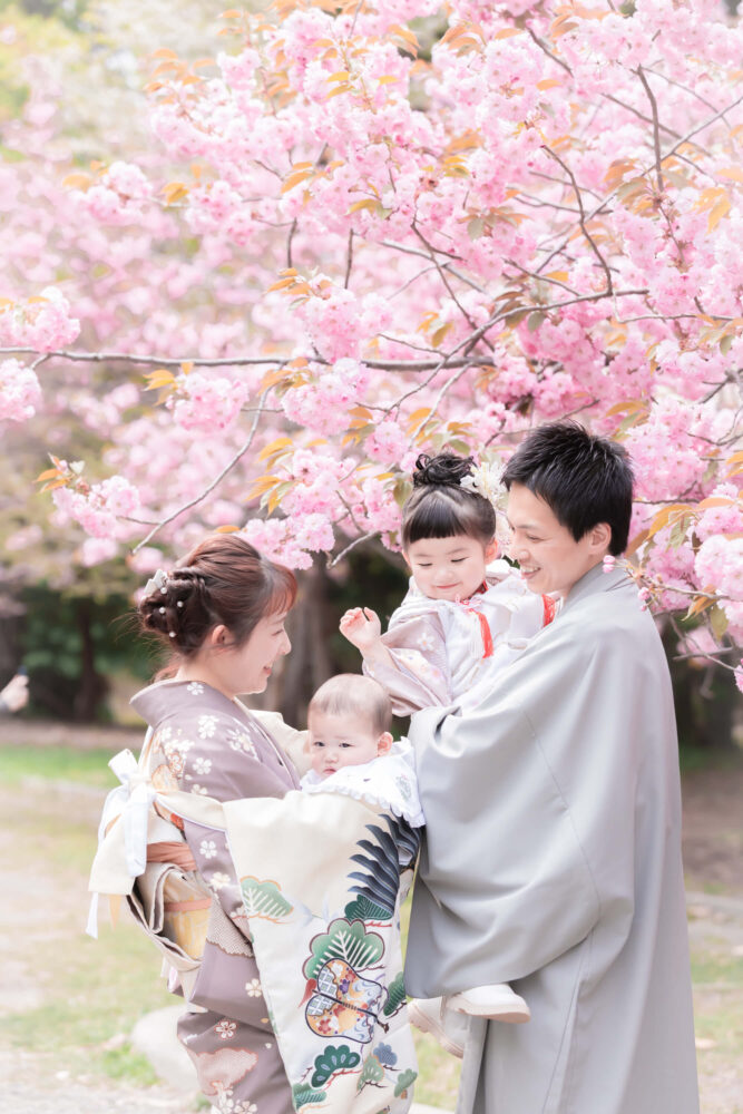 その隣で、パパとママも着物を着て並ぶと、写真の華やかさと「家族の一体感」がぐっと増します。