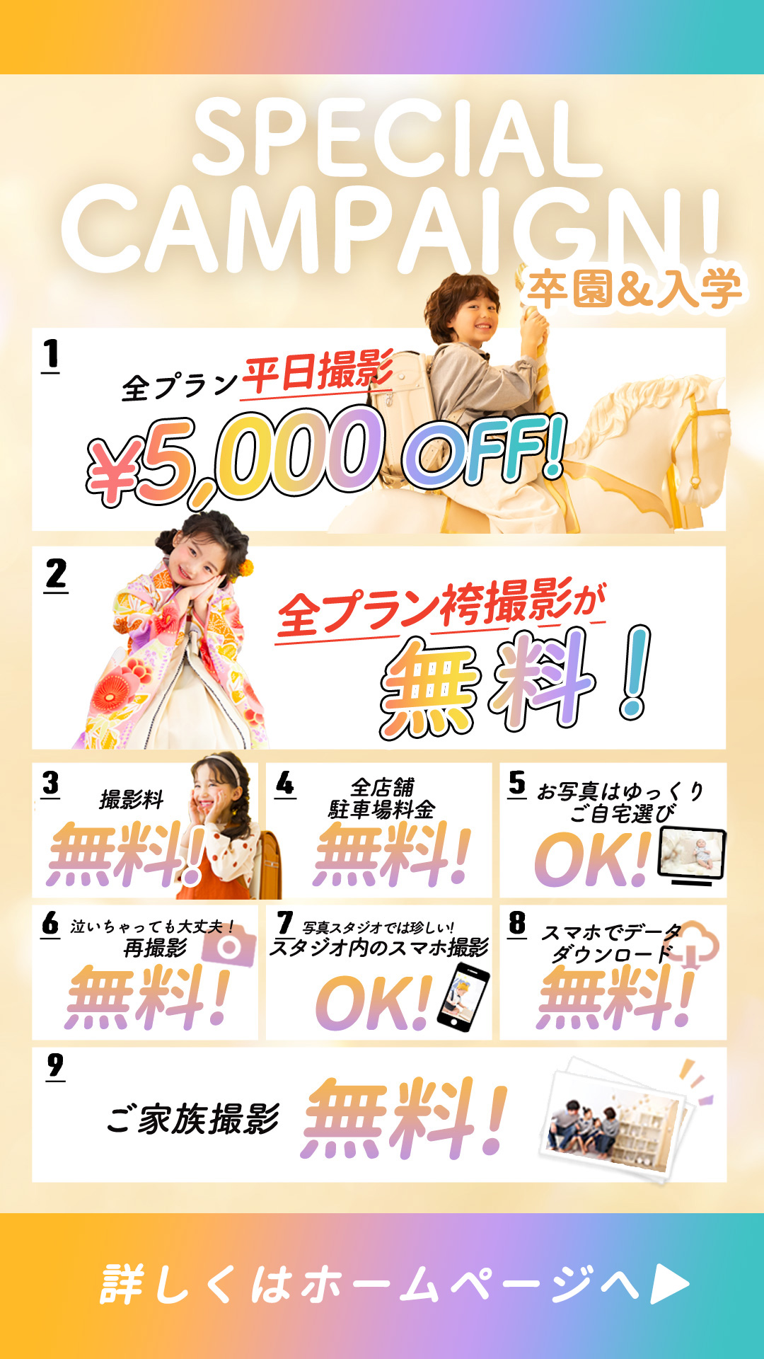 撮影種目:百日記念、ハーフバースディ、1歳お誕生日、七五三、入学