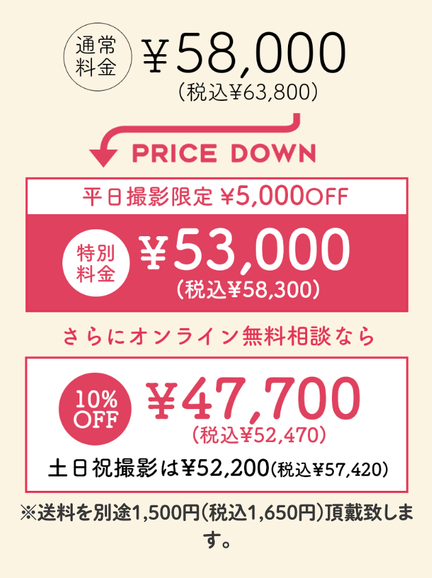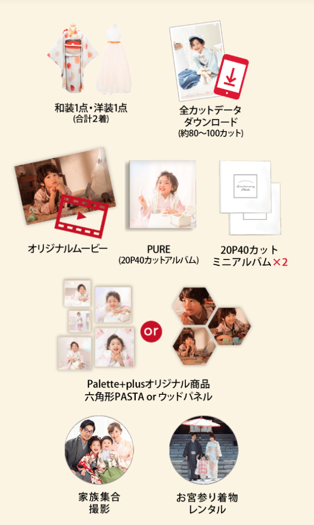 撮影種目:百日記念写真、ハーフバースディ、1歳お誕生日記念、七五三記念(男女)、入学記念写真