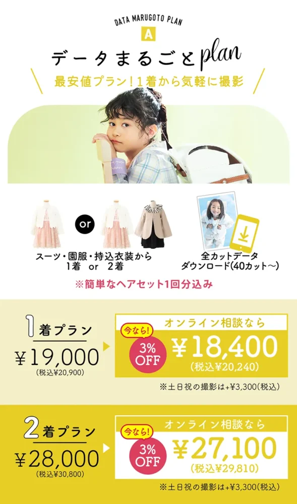 きょうだいデータまるごと plan:39,800円+税 。全カットデータときょうだい集合撮影 がついています。