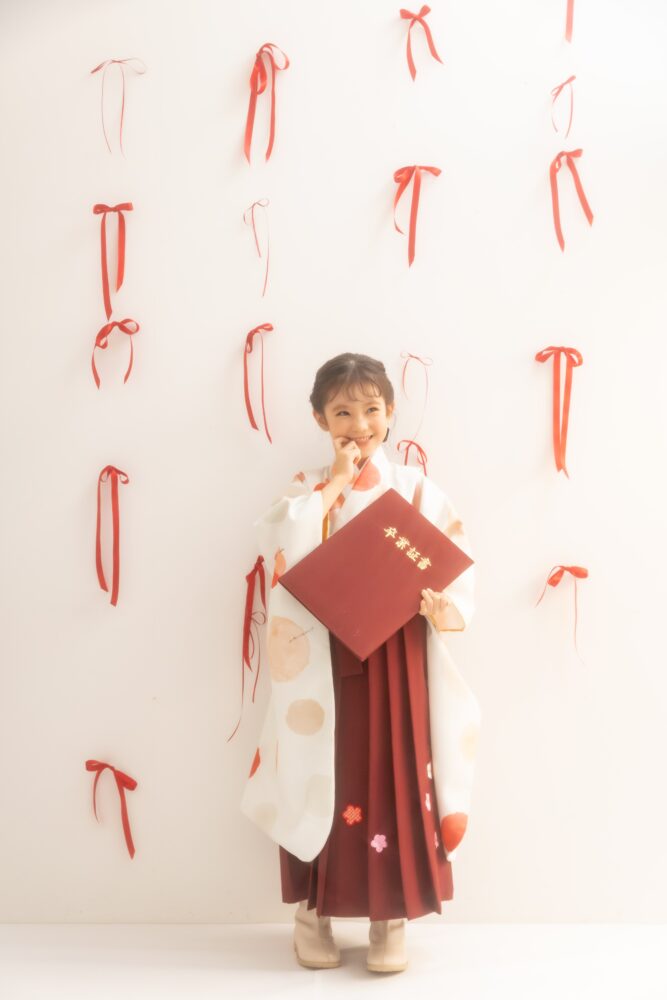 モダンな背景: 白い壁に垂れ下がる赤いリボンが、伝統的な袴スタイルに現代的なエッセンスを加えます。