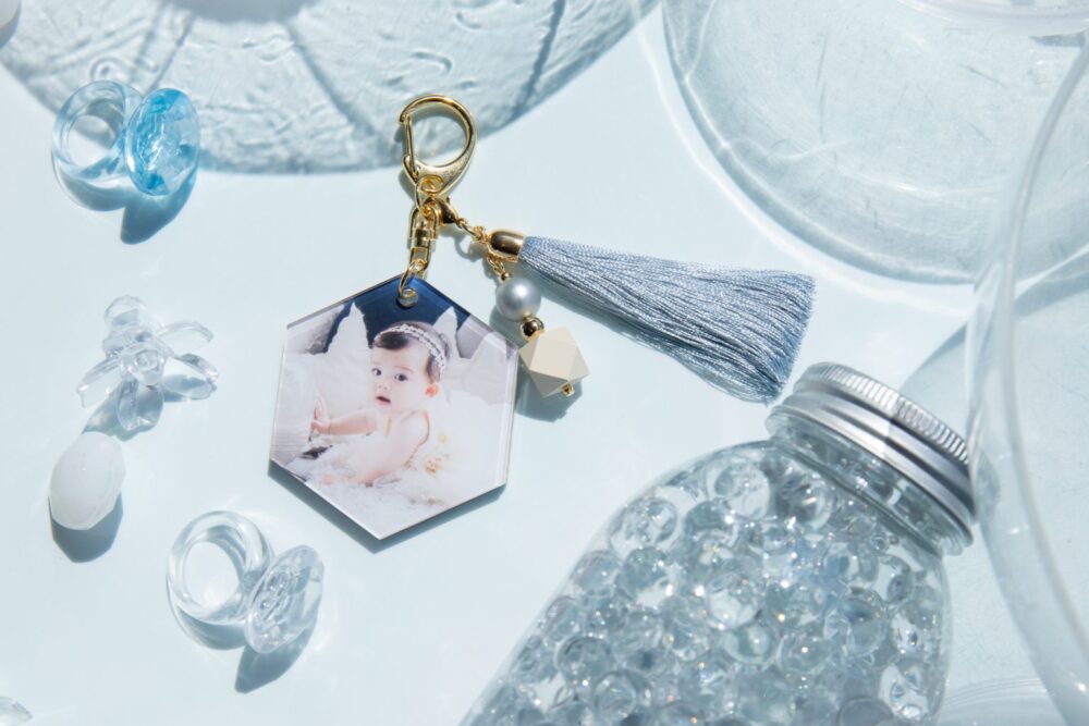 札幌西店限定アイテム 1 ハウスアルバム: スタジオごとのデザインが入った家型アルバム 。 フォトチャーム: アクリル素材が可愛い写真入りキーホルダー 。