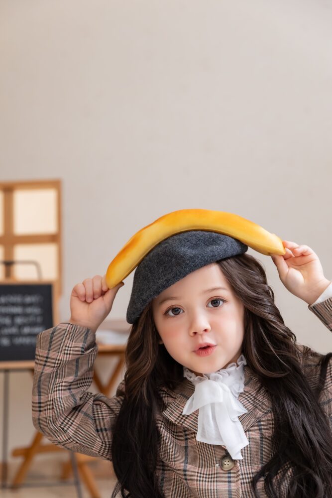「パン屋さん」でおしゃれにごっこ遊び: スタジオにはパン屋さんのような可愛い小道具も充実。自然に動いている瞬間の、生き生きとした表情を逃さずキャッチします。