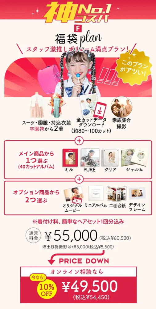特におすすめなのが、スタッフ激推しの**「福袋プラン(55,000円+税)」**です 。 このプランは、全カットデータに加え、選べるメインアルバムや2つのオプション商品が付いたボリューム満点の内容です 。物理的な商品をたくさん残したい方には、1点あたりの単価が抑えられるため、最も費用対効果が高いプランとなっています 。