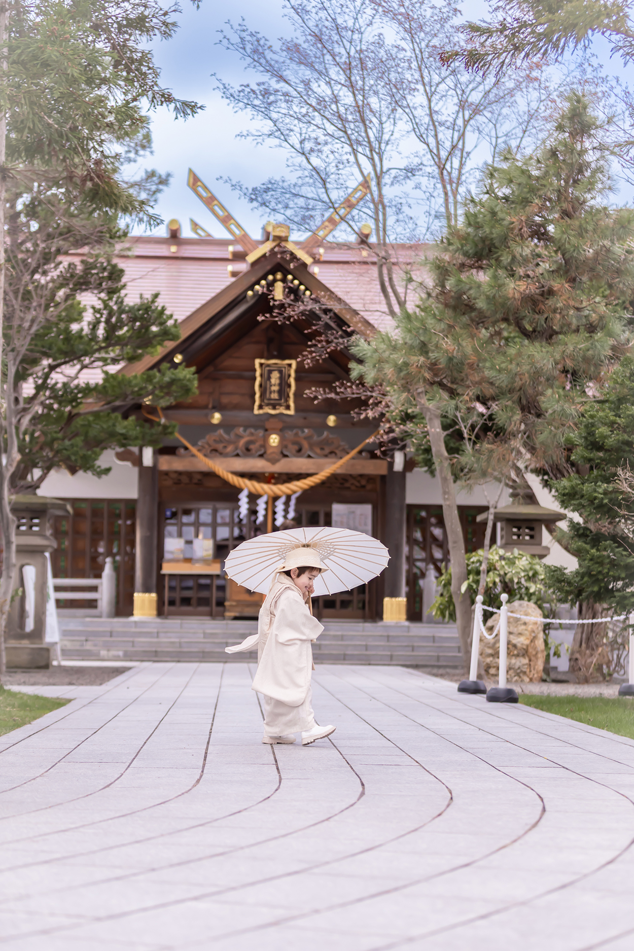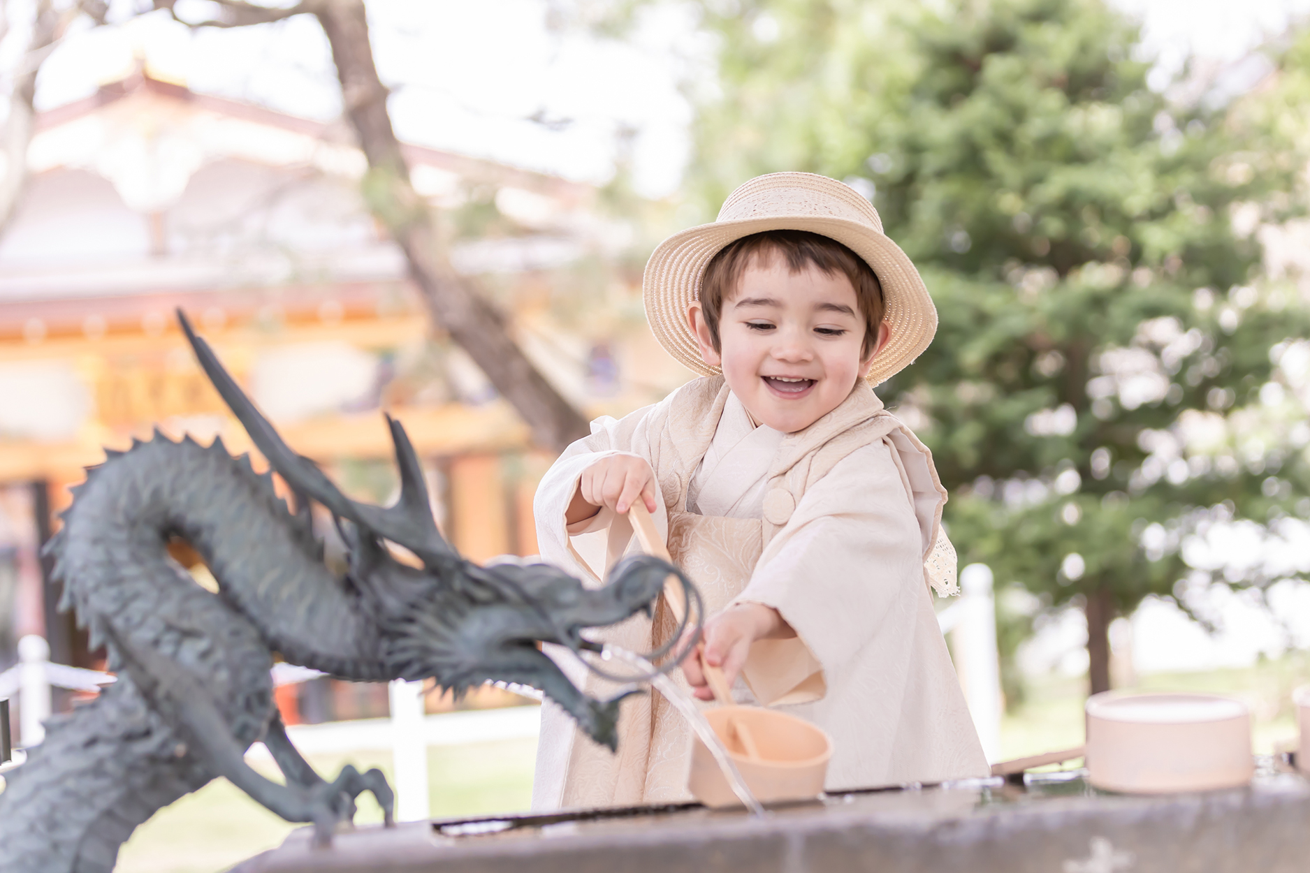 お子さまのキラキラした表情と、神社の柔らかな空気感が溶け合った