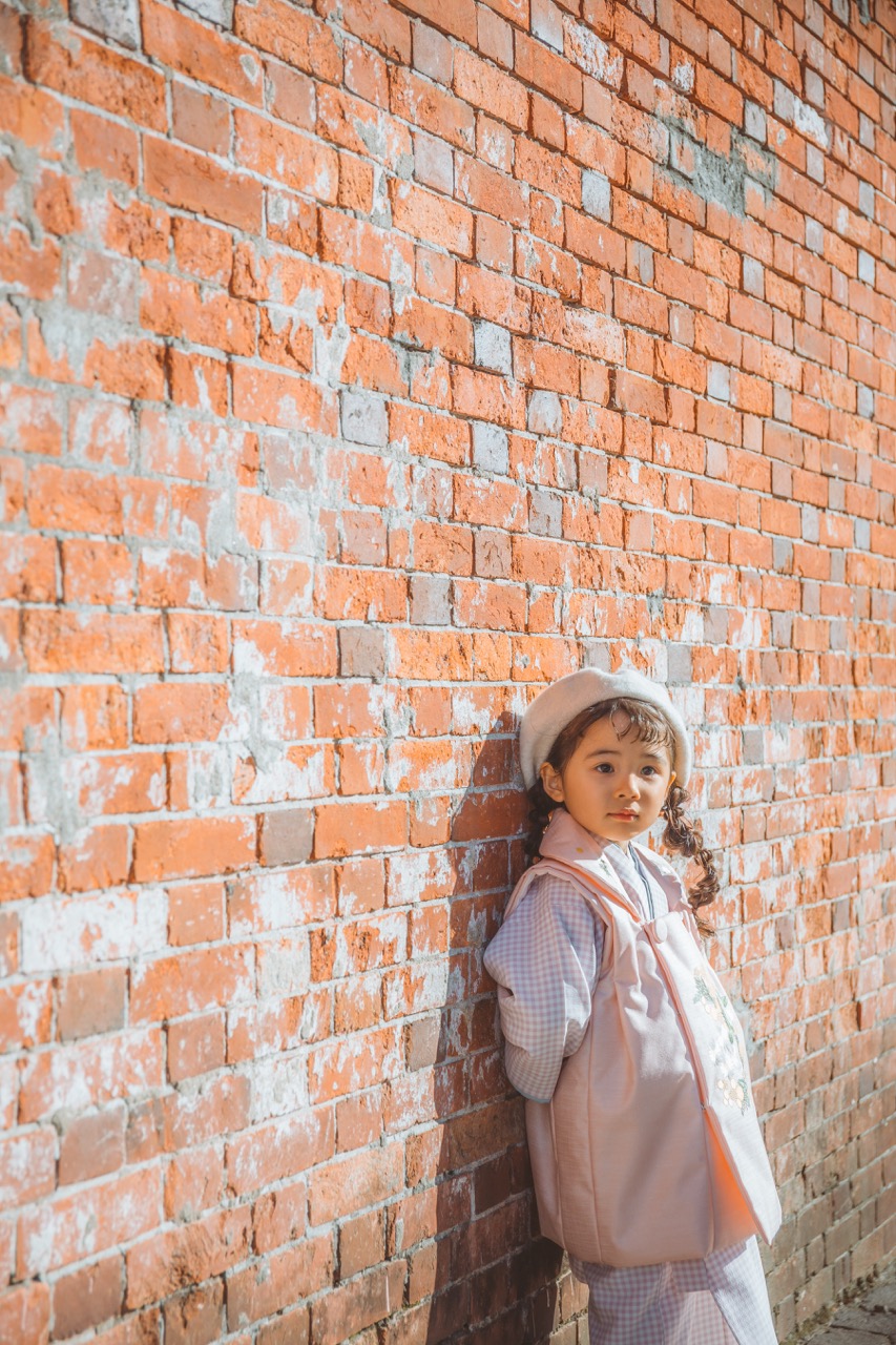 赤レンガの壁に寄り添うお子様の姿が印象的な一枚。