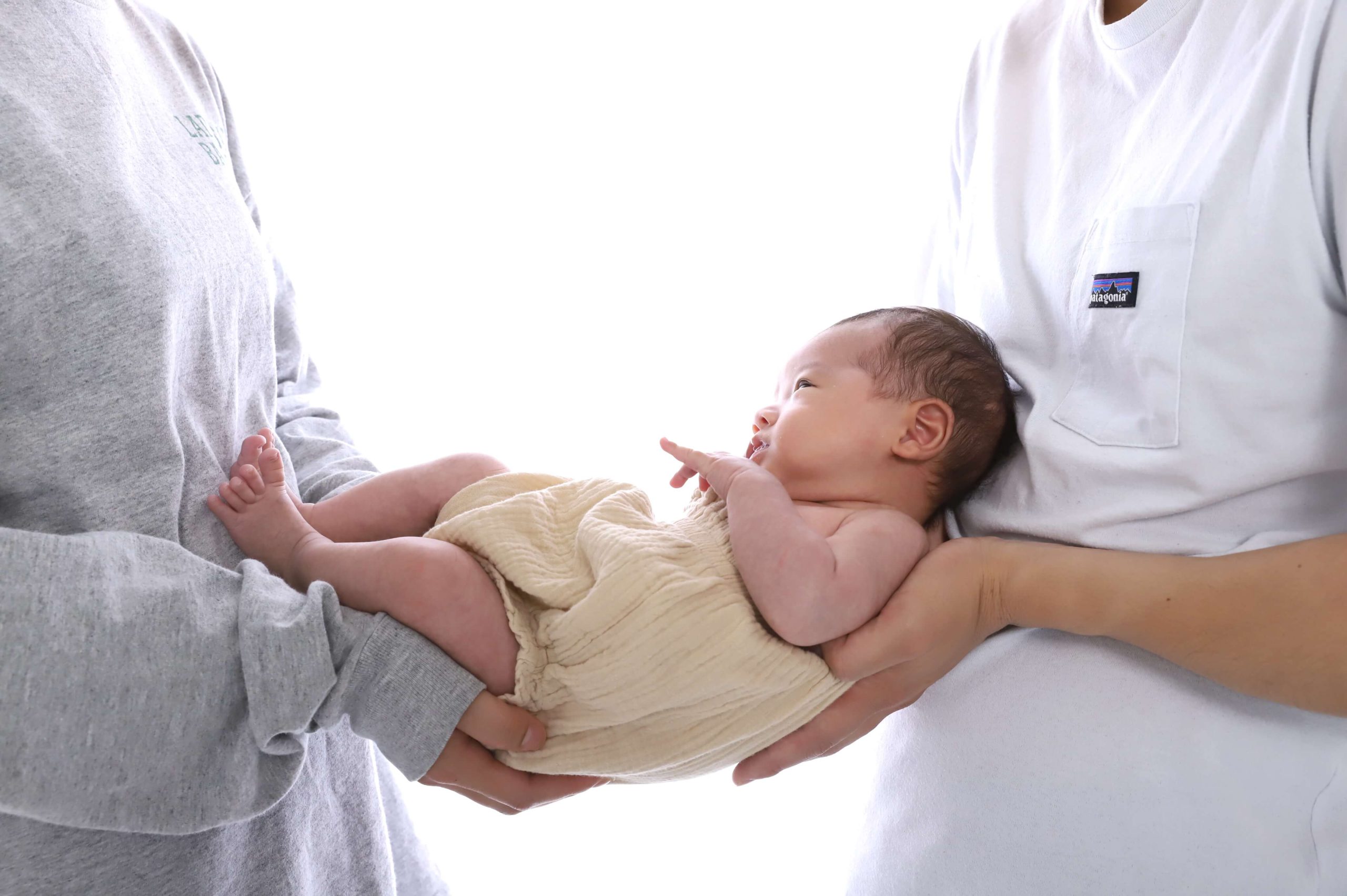 体が柔らかい1ヶ月さんは、ご両親にポーズをうまくとらせていただいて撮影します。