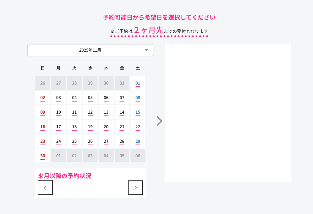 スタジオを選択すると空いているお日にちや時間が表示されますので、