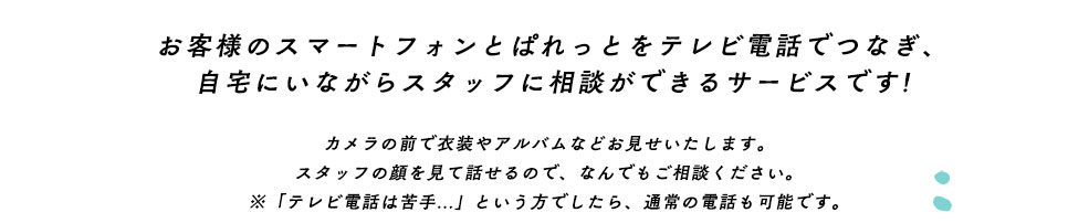 「子供が小さくて店舗まで見学に行けない…」という方も大丈夫!LINEのビデオ通話を使って、自宅にいながら約15〜30分でプランや衣装の相談ができます。 お子様が一緒に参加しても、カメラをオフにしてもOK。