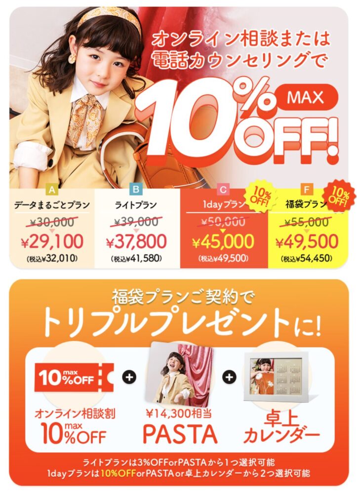 最高のビジュアルで撮影するなら、お財布にも優しく、かつ素敵な商品で残したいですよね。当店では、ママ・パパに嬉しいお得なシステムを完備しています。