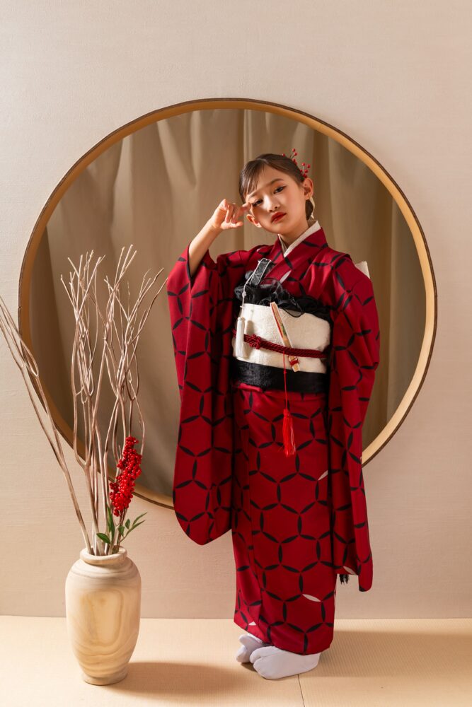 今回ご紹介するのは、深い赤を基調としたモダンな幾何学模様の着物スタイルです。