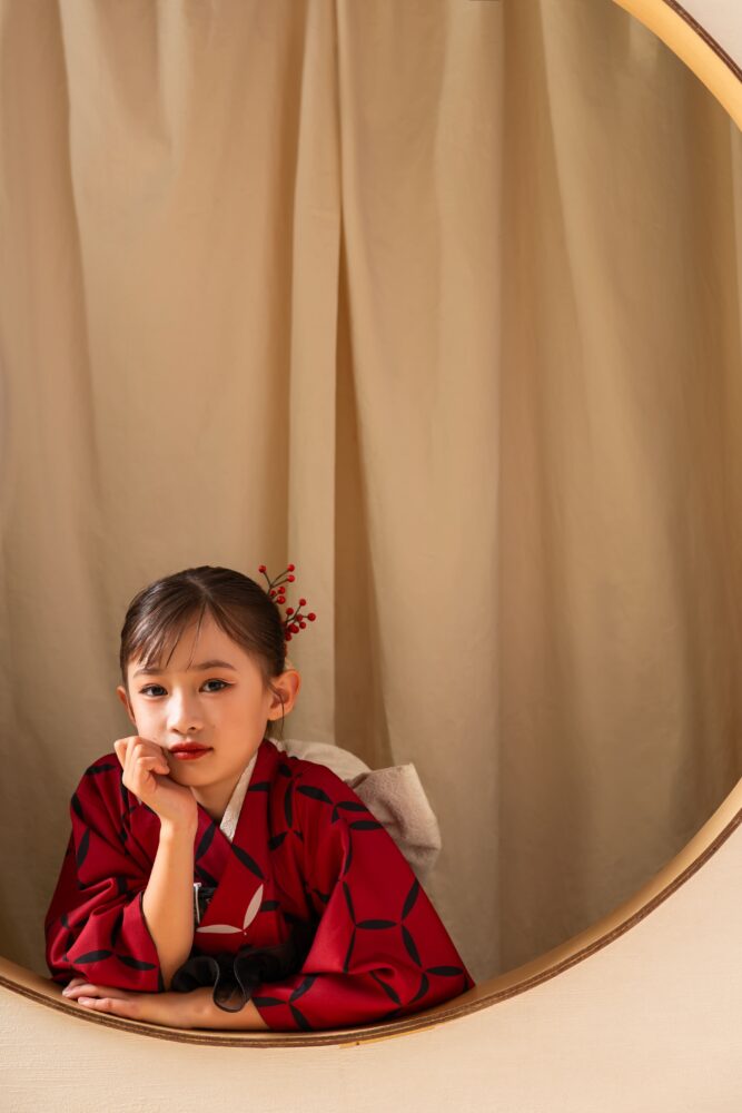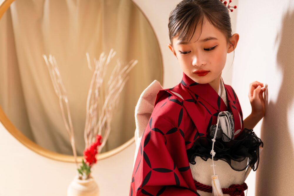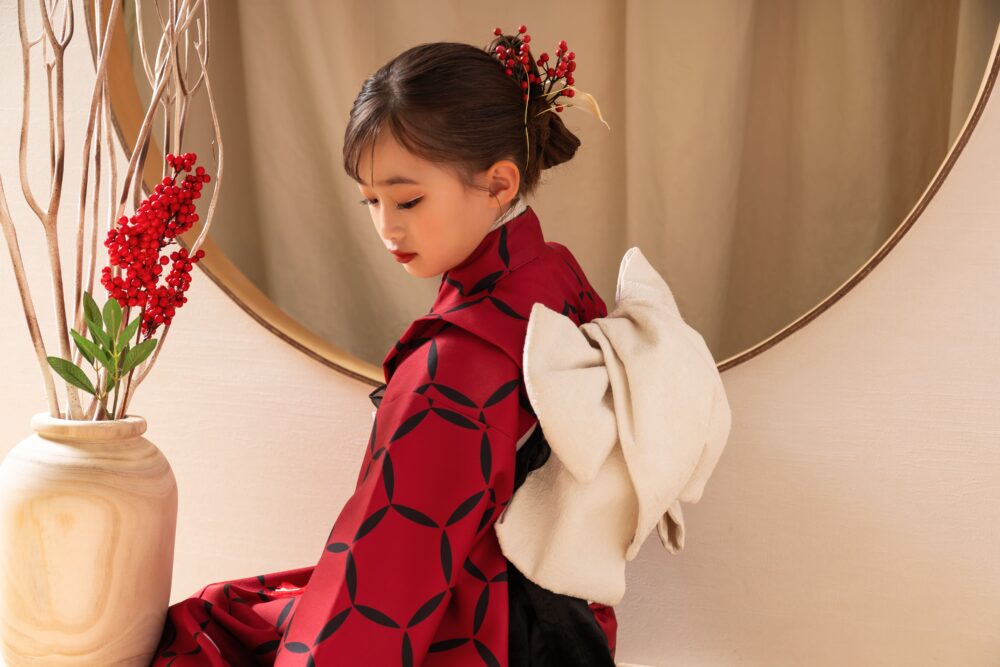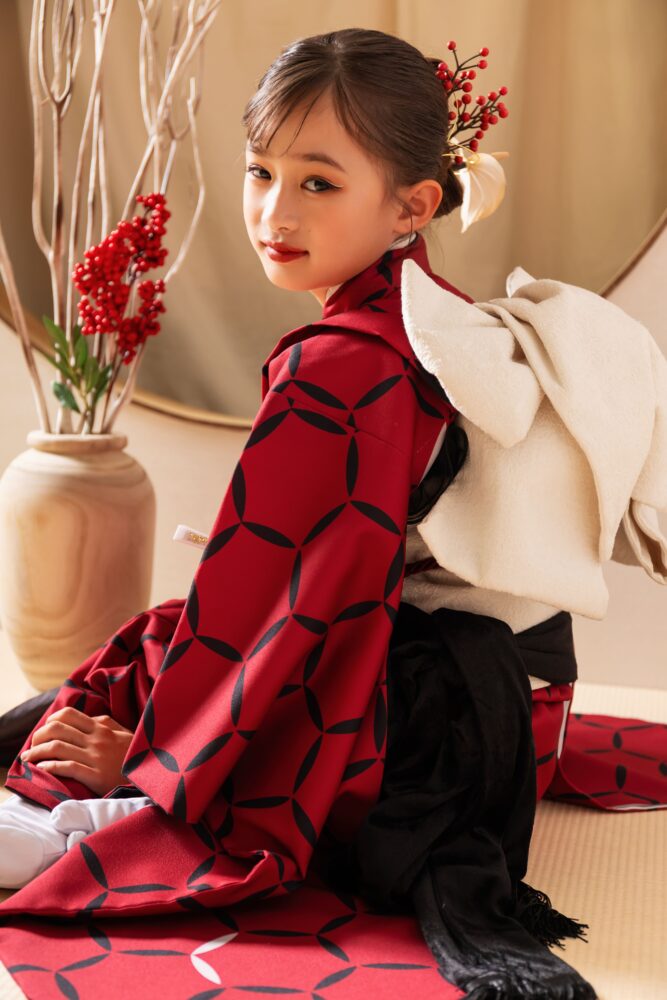 Palette plus 札幌西店では、伝統的な着物の美しさに現代的な感性を掛け合わせた、洗練されたスタイリングをご提案いたします。 今回ご紹介するのは、深い赤を基調としたモダンな幾何学模様の着物スタイルです。 落ち着いた色合いの中にも凛とした強さを感じさせる一着は、お子様の成長した表情をよりドラマチックに演出する今までのSAKURAには雰囲気のビジュアルになっております。