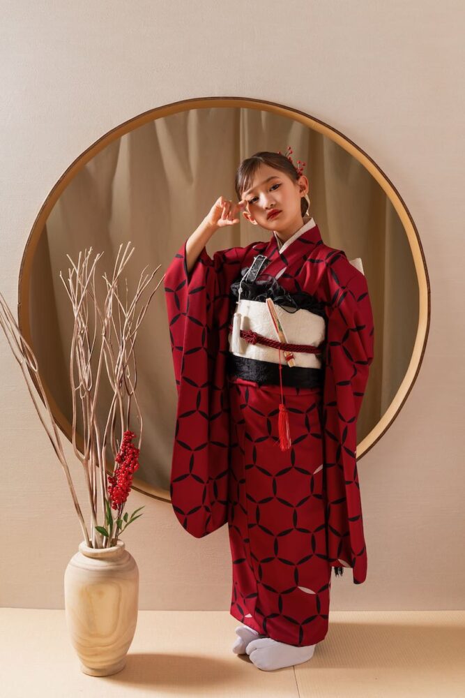 深く鮮やかな赤が印象的な「紅凛」。伝統的な重厚感がありながらも、モダンな空気感を纏ったこの一着は、お子様の表情をパッと明るく、華やかに彩ります。