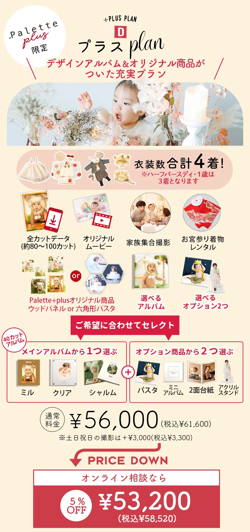 撮影プランをご紹介。データのみの気軽なプランから、アルバムやオプションがたくさんついた充実プランまで。