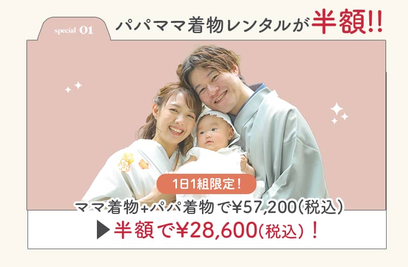 なんと!!通常2人分合わせて¥57,200(税込)のパパママ着物レンタルが、半額の28,600円に!!