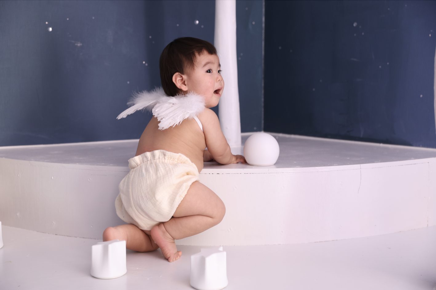 西岡店にあるかぼちゃパンツを履いて、お持ち込みの天使のはねで裸ん坊撮影!