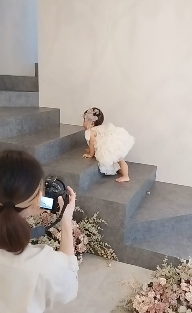 大きなグレーの階段とピンクのお花のあるスタジオです!