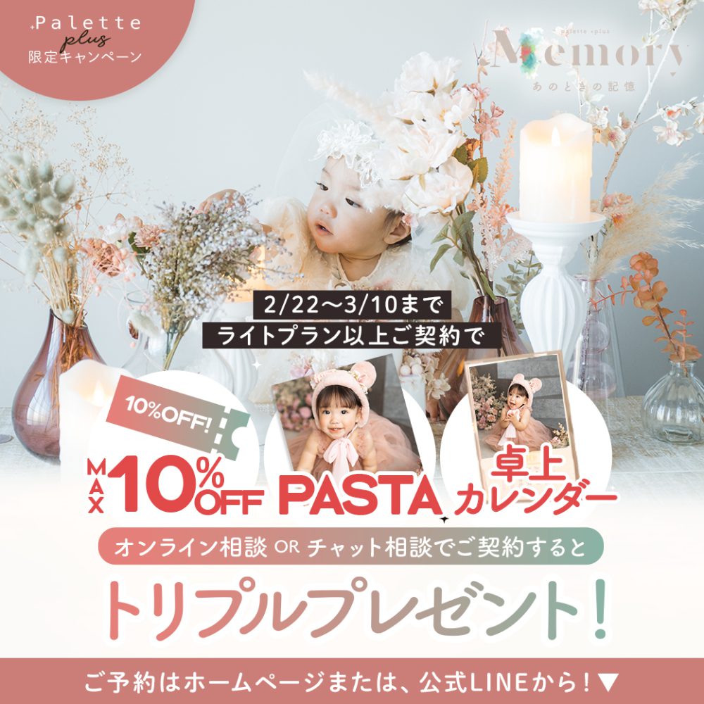 Palette Plus 店舗限定で緊急キャンペーンが開始!! 4月までの撮影をご検討されている方はぜひこのお得な期間にご成約されることをオススメ!! まずはお気軽にオンライン相談のご予約をお待ちいたしております!