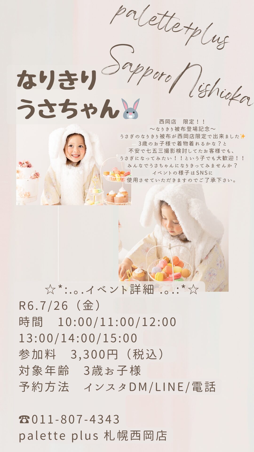 Palette plus札幌西岡店限定イベントがスタート! みなさんこんにちは! 札幌市豊平区西岡にあるベビーキッズ専門フォトスタジオ、Palette plus札幌西岡店です! R6,7/26(金)開催決定!! "なりきりうさちゃん🐰" 西岡店限定被布『うさぎ被布誕生』を記念して。。。 うさちゃんになってみませんか? 赤ちゃんの時に着ぐるみ着たけど、大きくなるとないよね。。。 という声が多かったのもあり、作成いたしました! 小さい頃の着ぐるみの写真と並べてみてはいかがですか? うさちゃんになりたい!!という子、もちろんOK🙆♀️ そうではなく、七五三の歳だけど。。。 うちの子、着物着れるのかな?と不安で諦めようとしていたパパママ! 着物チャレンジしてみるにはもってこいのイベントになるので、ぜひこの機会に!!