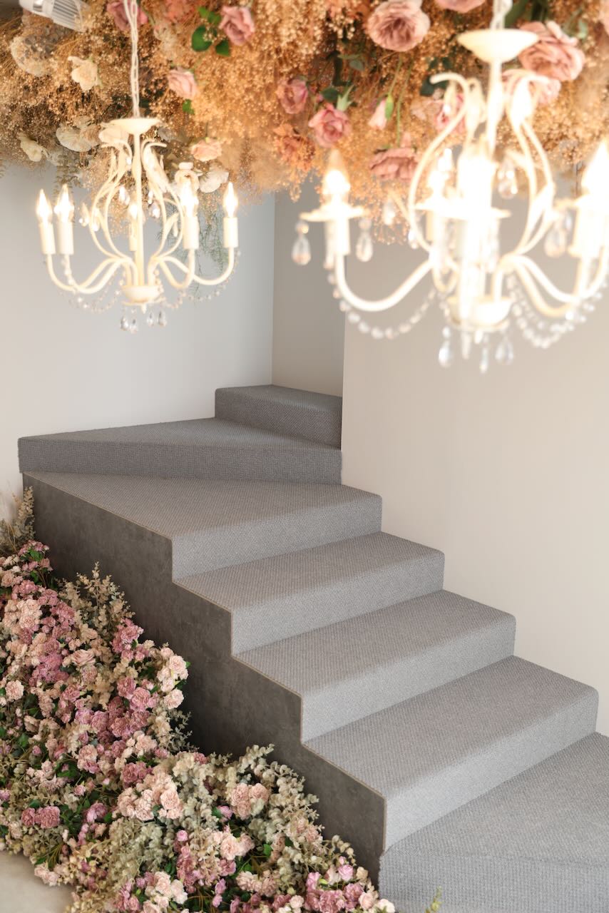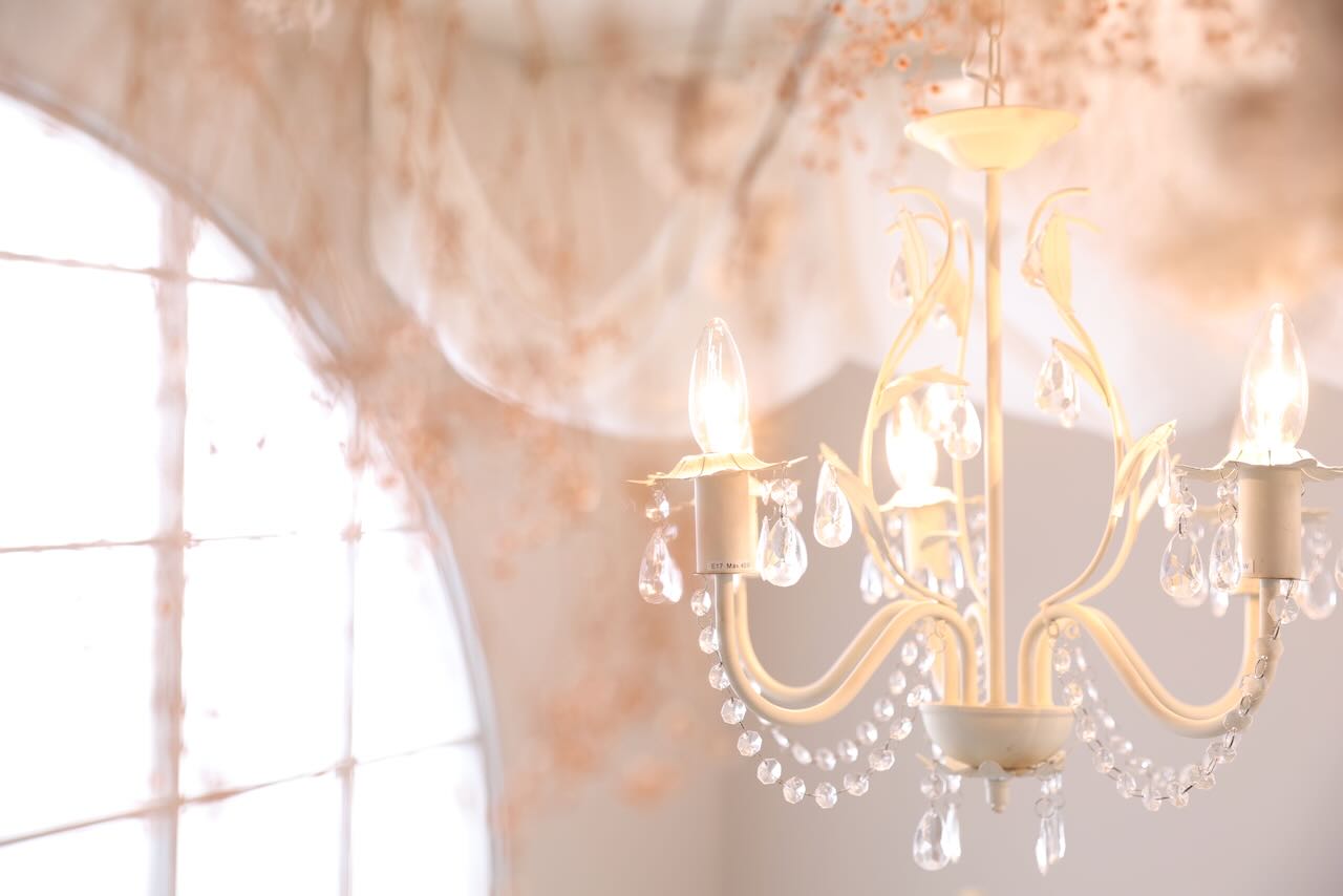 まずお部屋に進むと階段とバラ、ドライフラワーの天井、そしてシャンデリアが目に入ってきます!