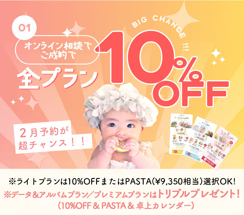 1月キャンペーン終了まで残りわずか!オンライン相談でプレゼント★トリプル特典をご紹介します!!ベビー、キッズの撮影をするなら今がチャンス。