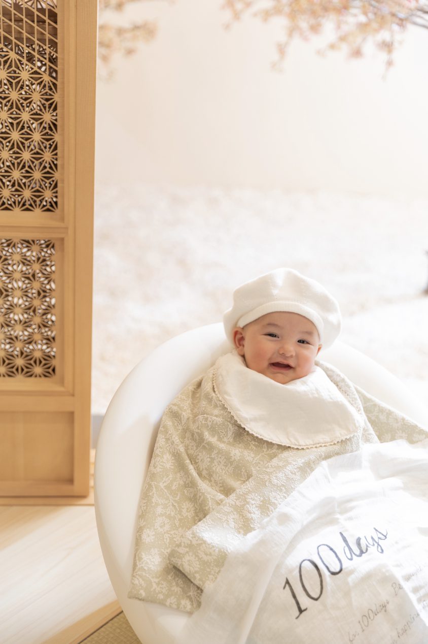 お祝い着は手を隠して撮影します。撮影スタイルとしてもまだごろごろねんねの100日さんのみ撮影ができるもの。