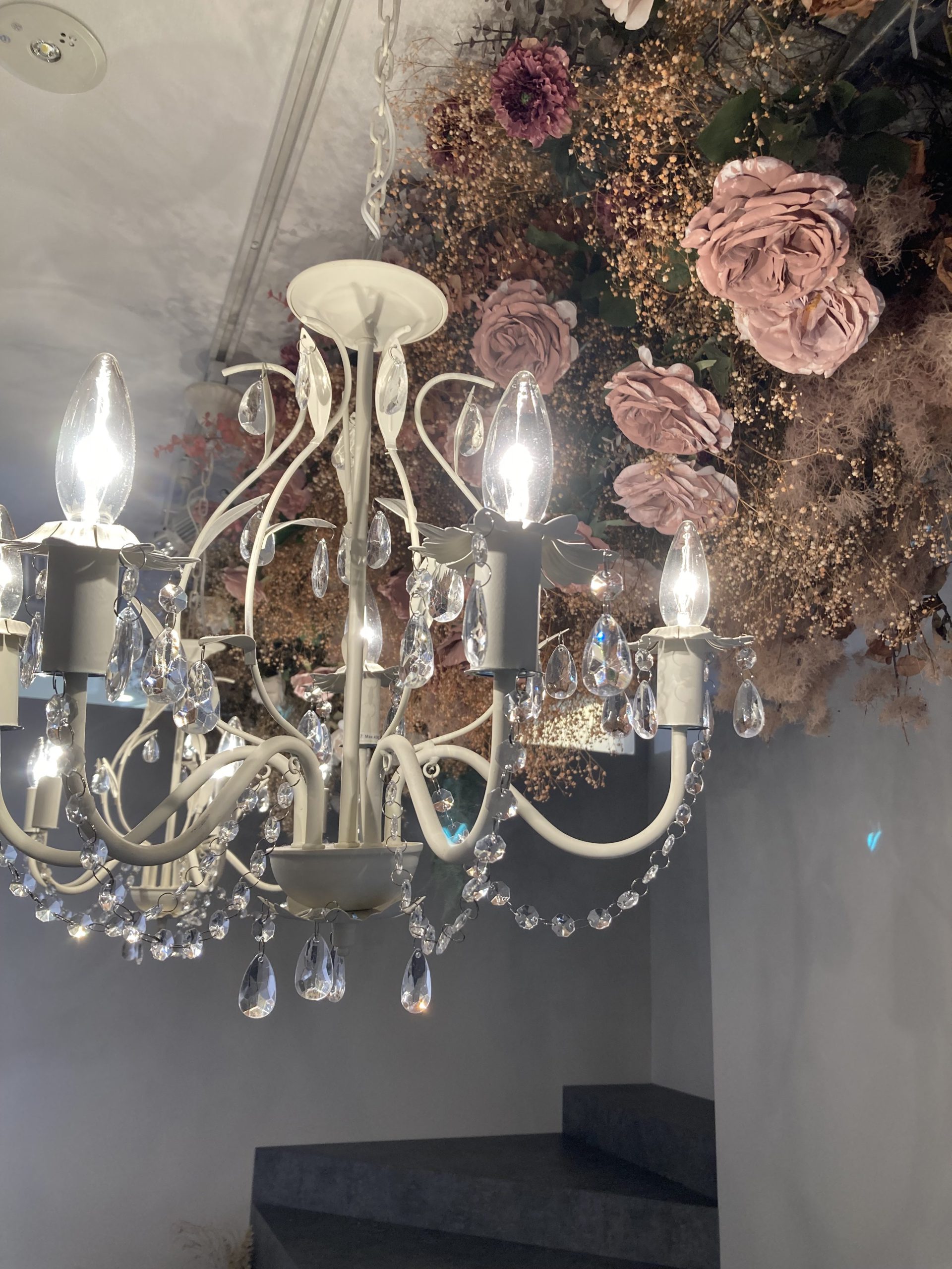 はないろスタジオはピンクのお花と大きな階段のあってプリンセスのお部屋のようなシャンデリアがある。。。