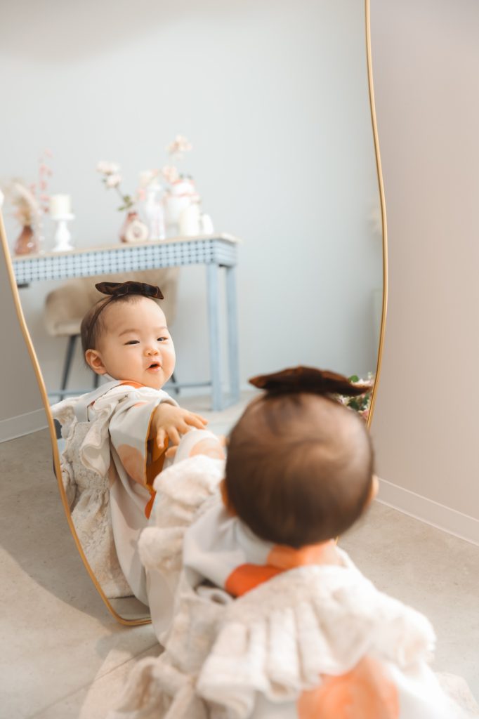 鏡に映る自分の姿を見るとご機嫌な表情を見せてくれるお子様も多いので