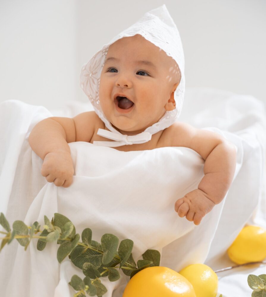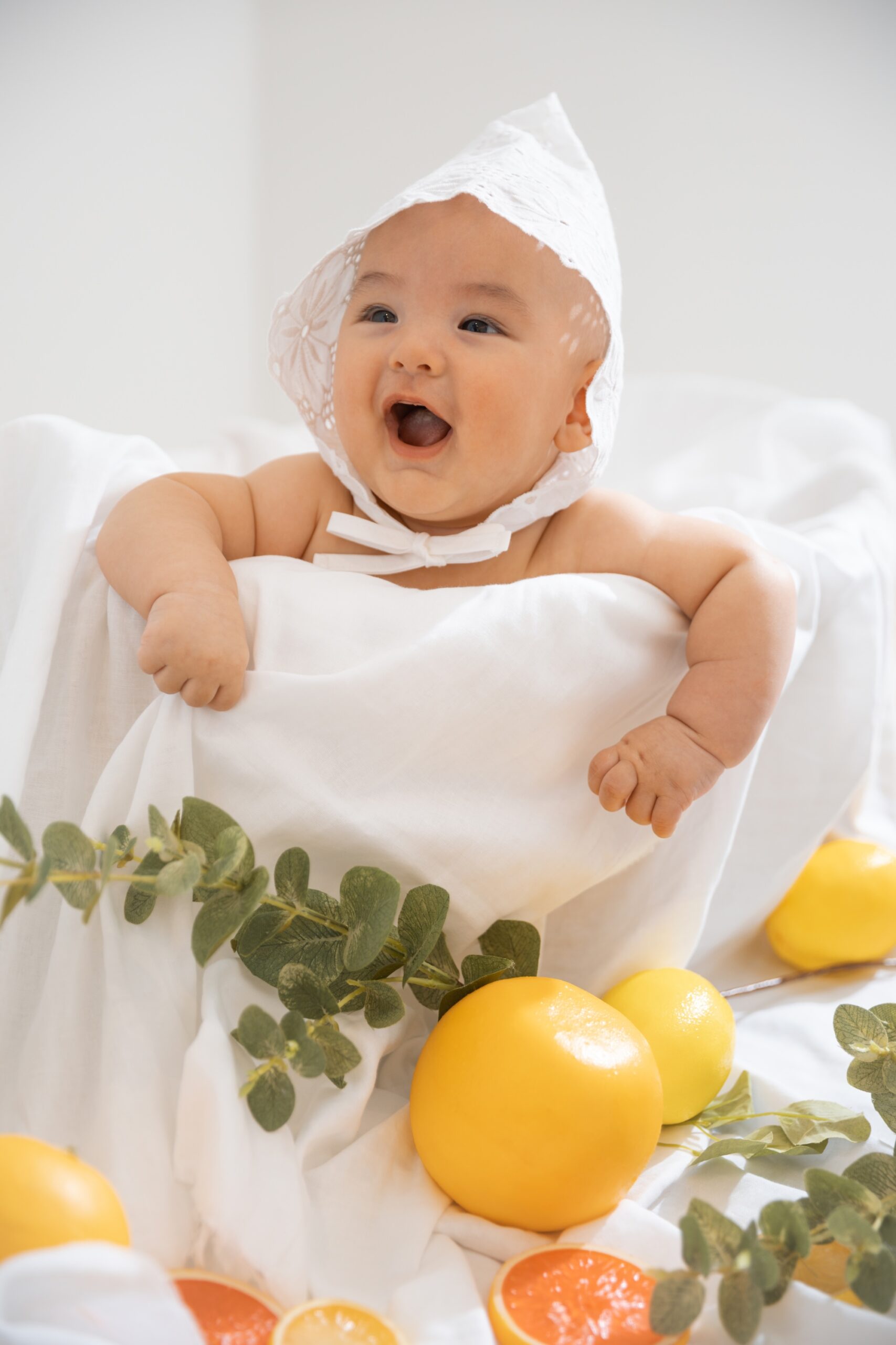 赤ちゃんの泣き顔も大切な思い出 。もし撮影中にぐずってしまっても、プロのスタッフが上手にあやしながら進めますし 、どうしても難しい場合は無料で1回までの再撮影も承っていますのでご安心くださいね 。