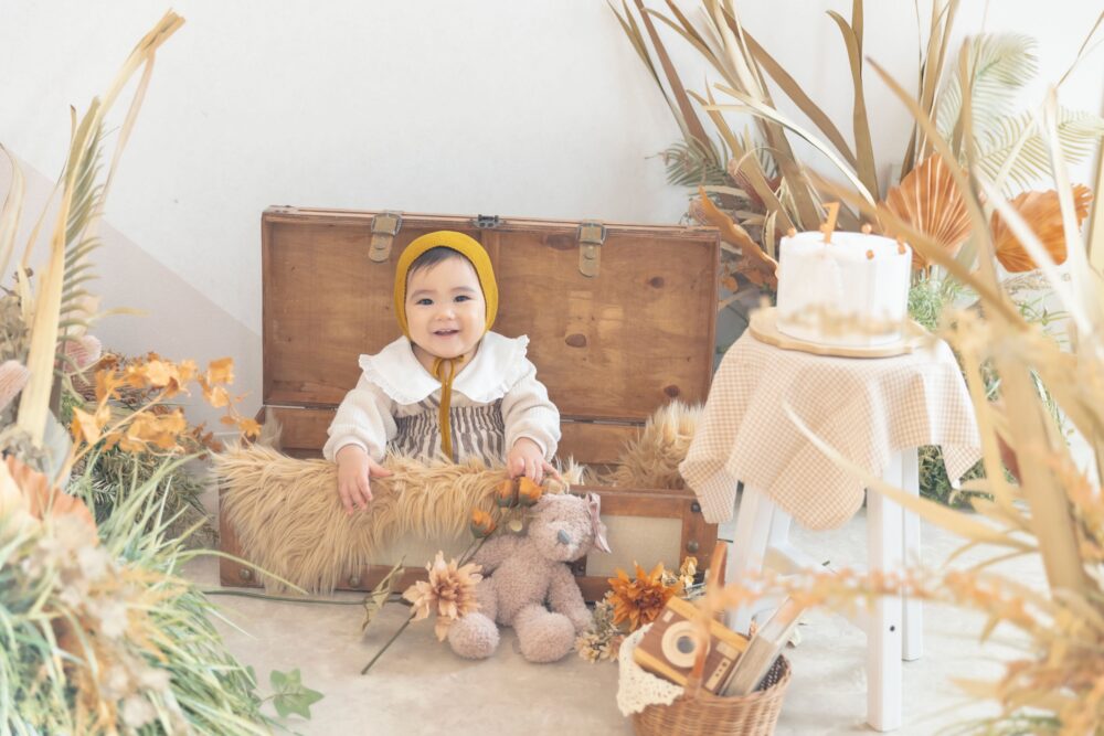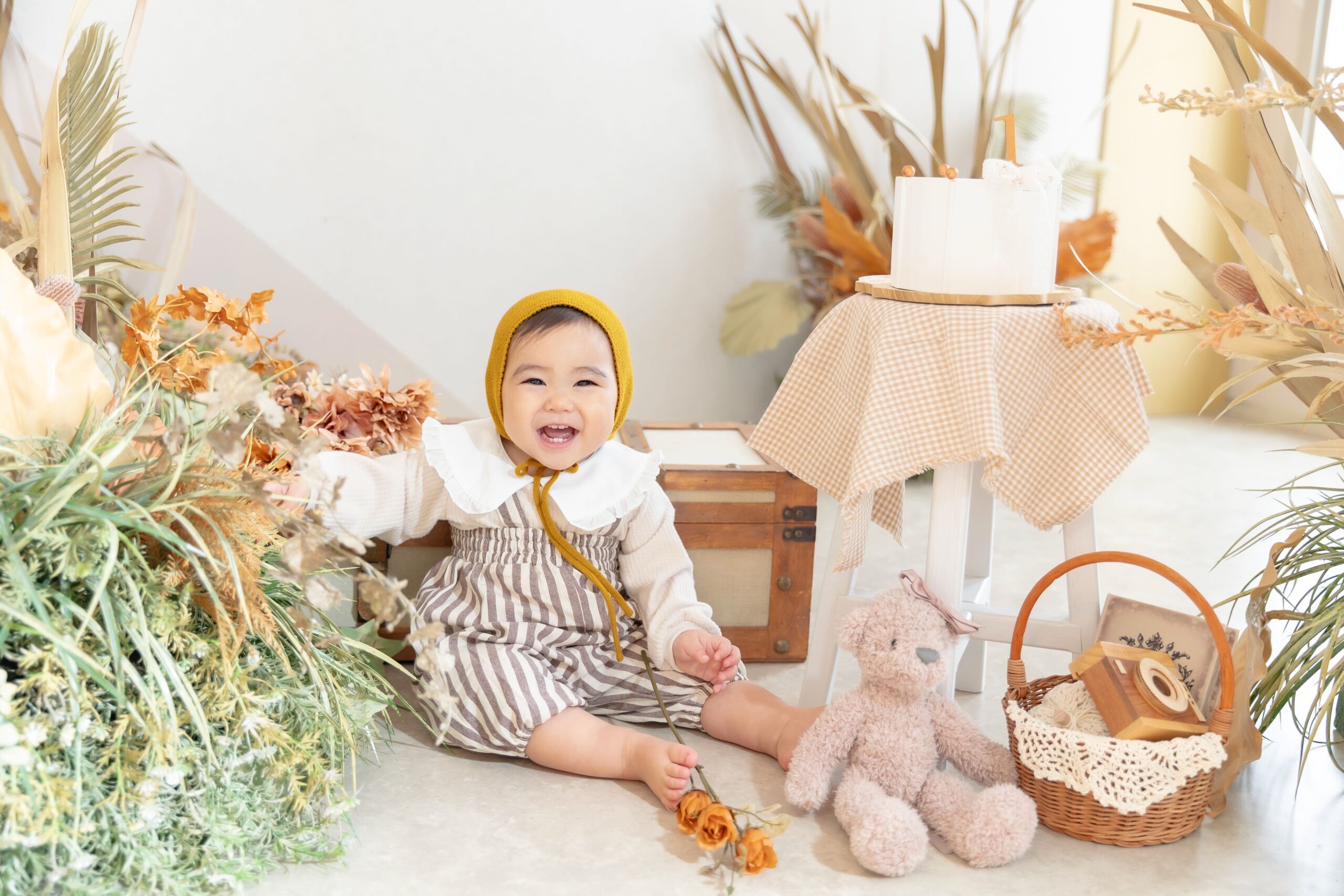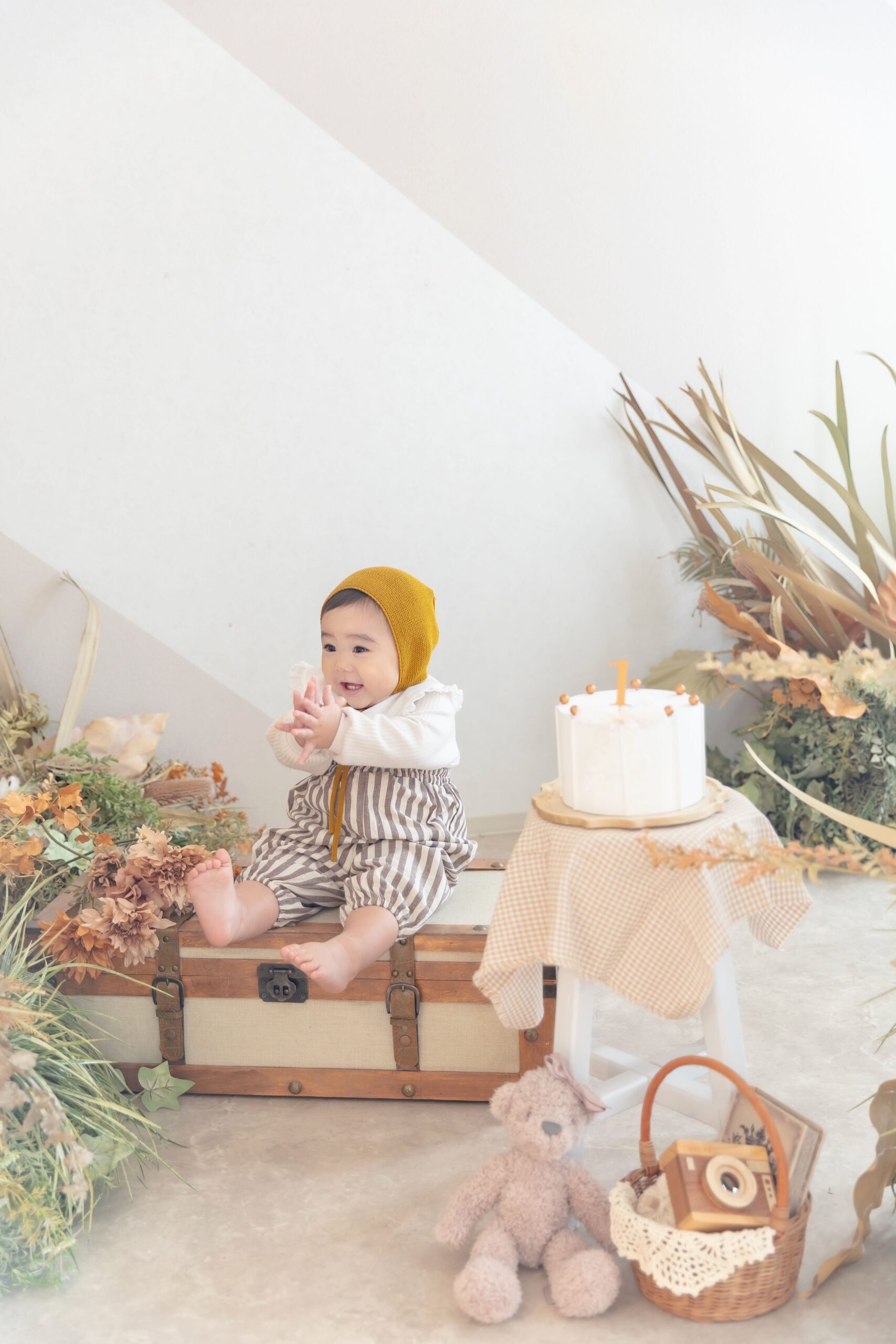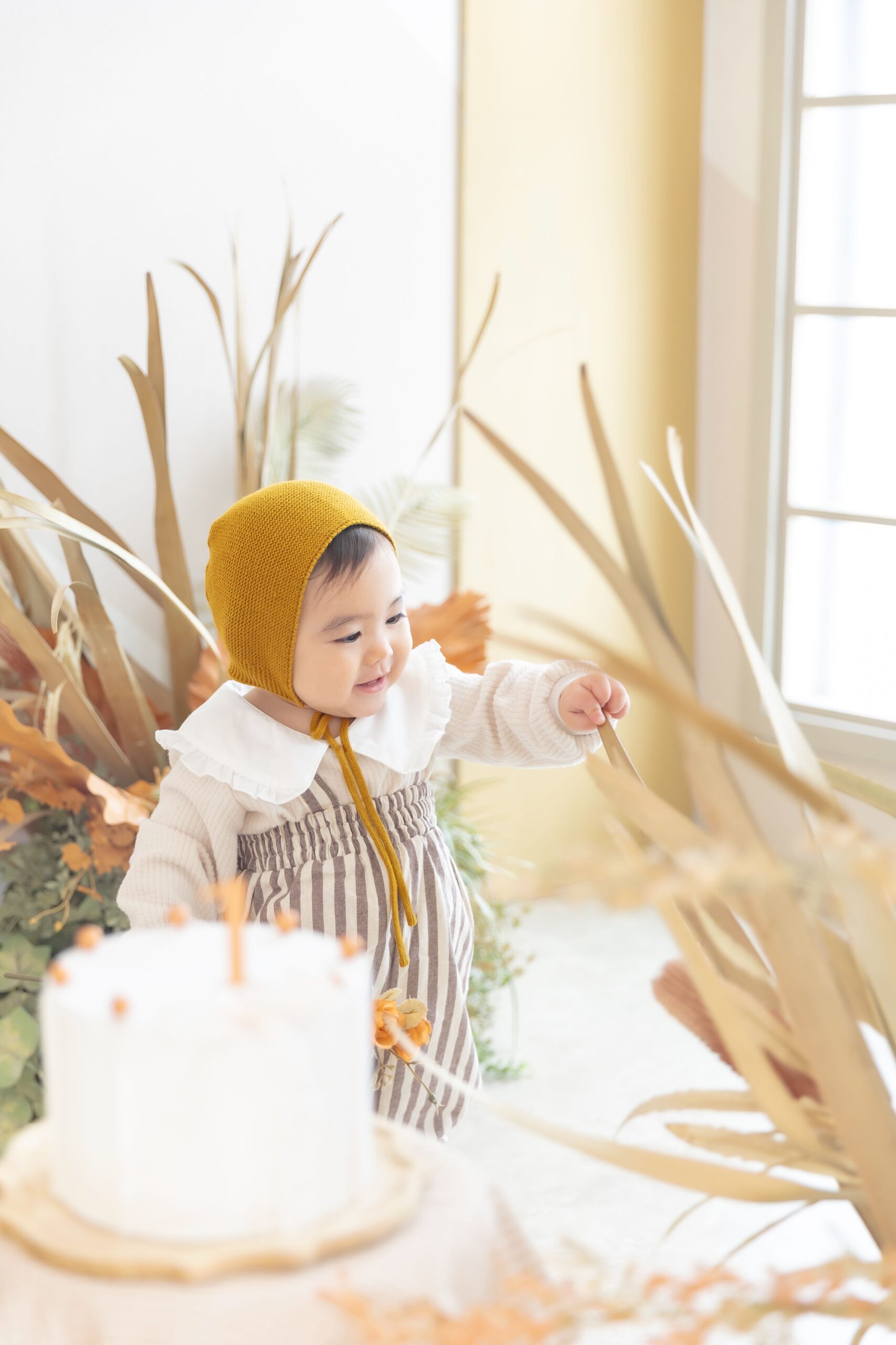 スタジオの全体感にマッチするからし色の帽子がむっちりほっぺなお子様にピッタリ!
