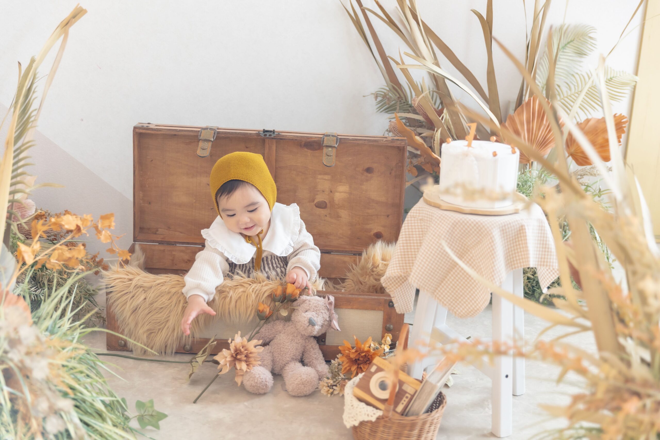 ①.1歳お誕生日記念の衣装数が通常3着のところ+1着追加で合計4着撮影に!