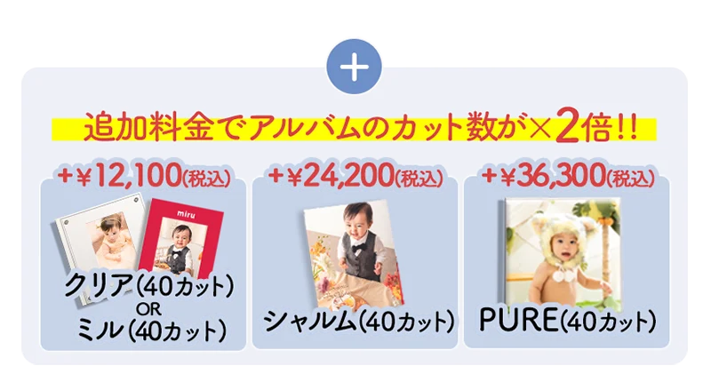 プラン内アルバムだと全20カットの「マイブックアルバム」ですが、追加料金で「40カット収容アルバム」への変更も可能!