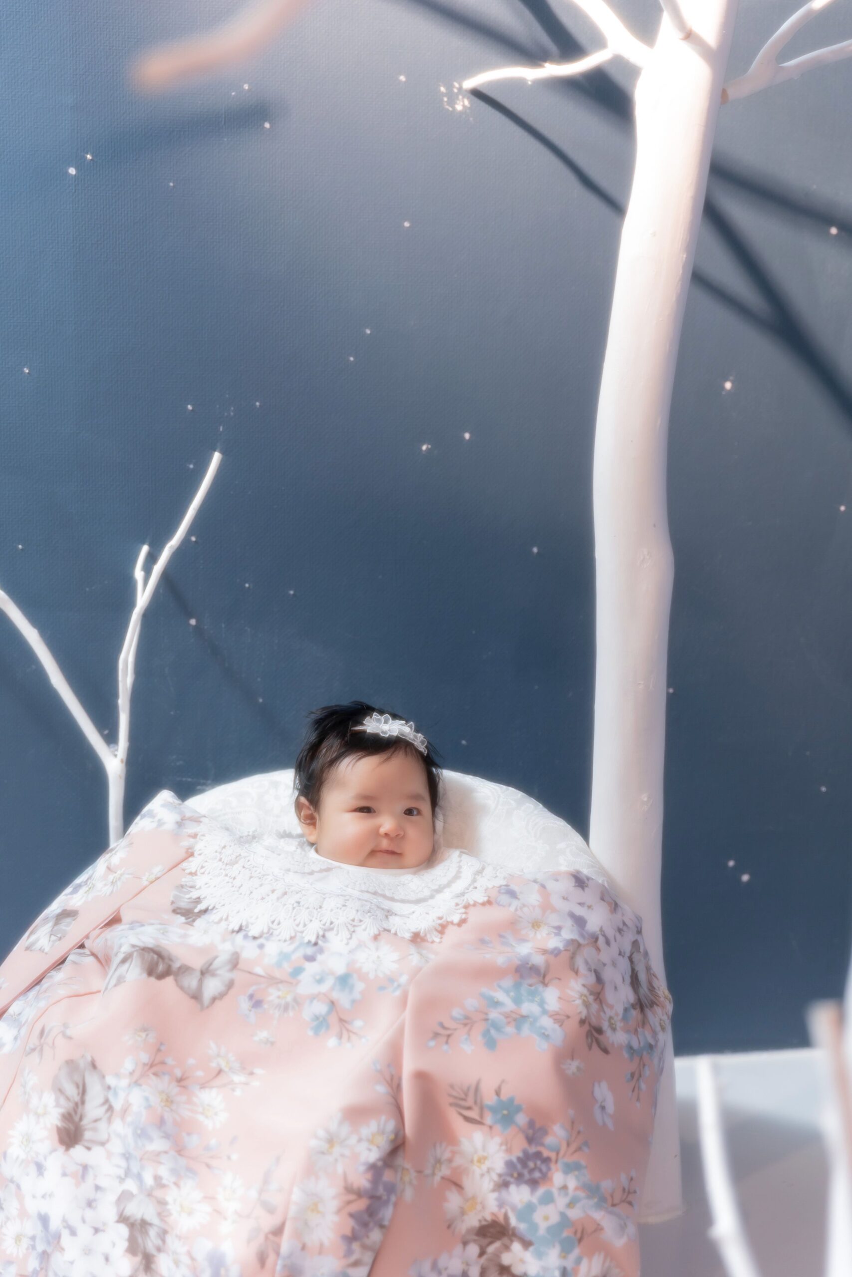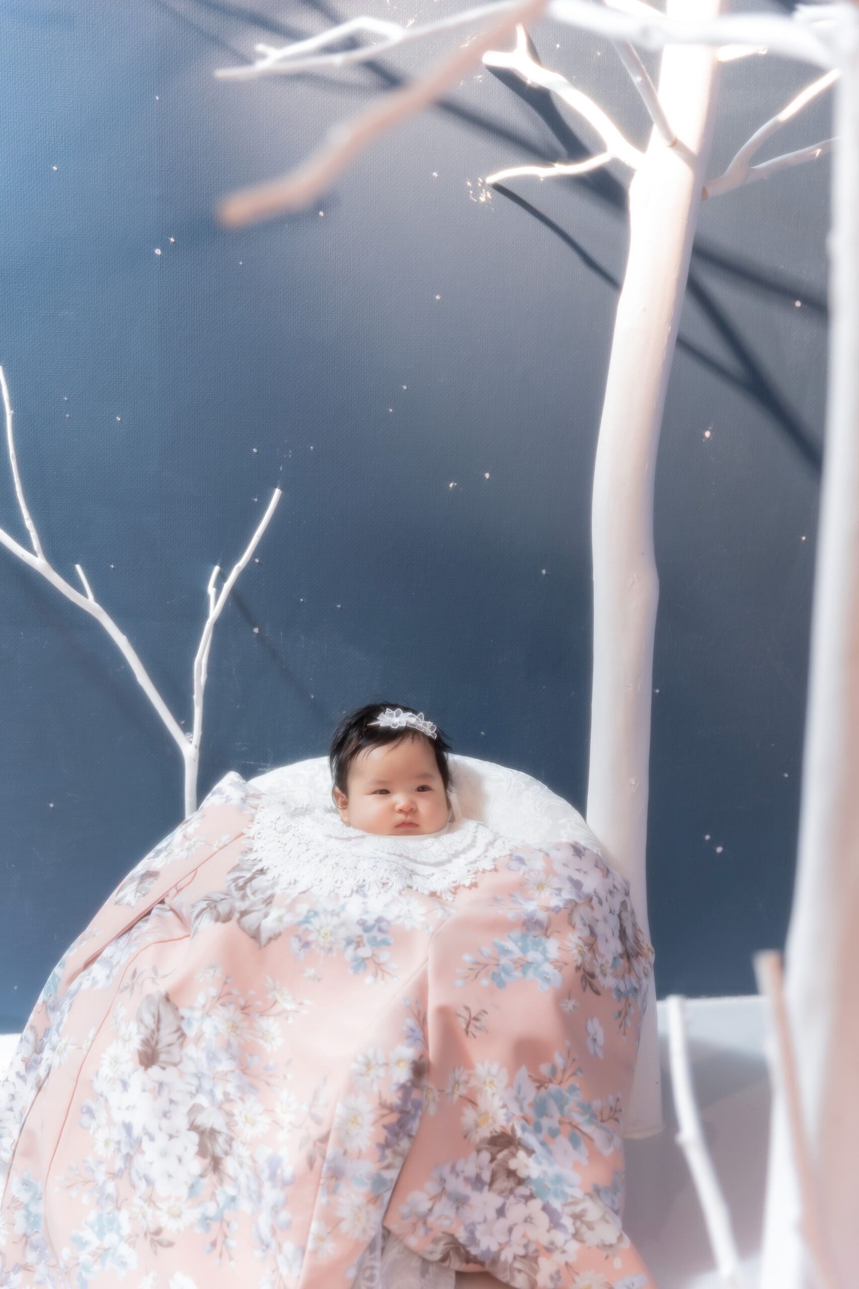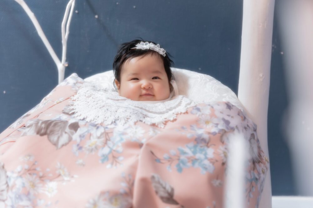 今回ご紹介の衣装ペールピンクに花柄の百日専用祝い着です😌
