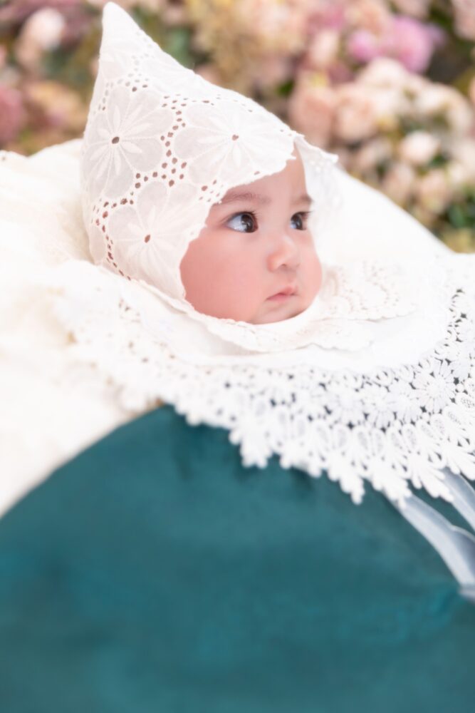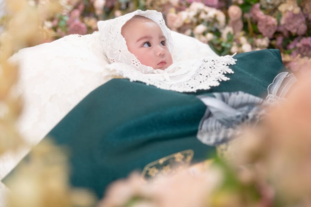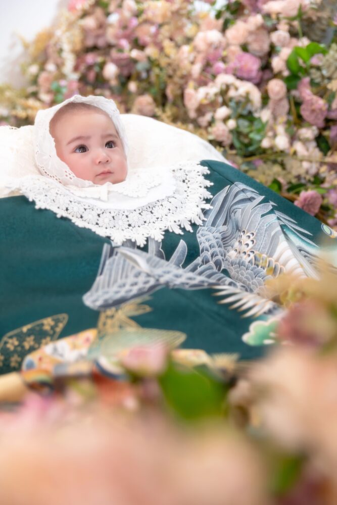 今回ご紹介の衣装はくっきりとした緑の百日専用祝い着です😌
