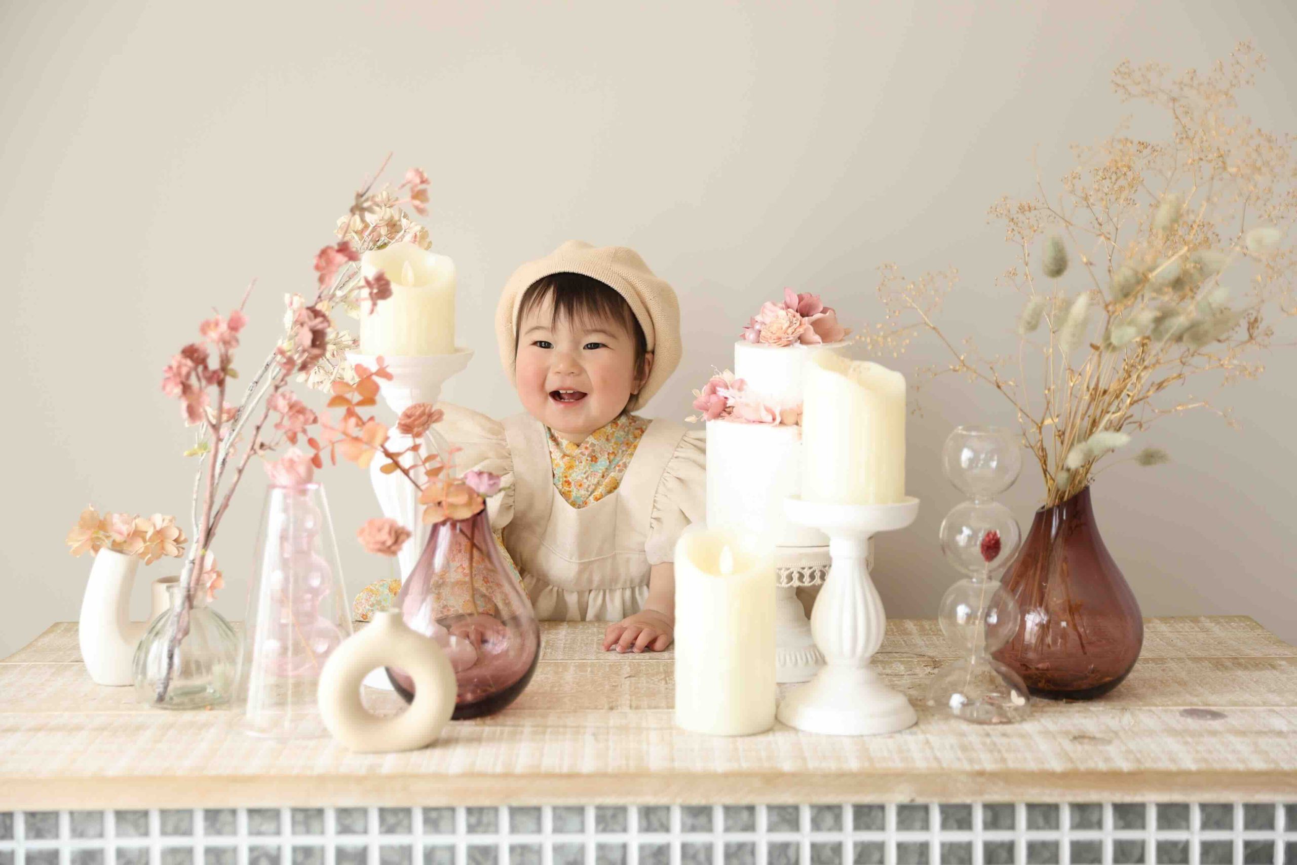 はないろスタジオで撮影の1歳女の子をご紹介します!お誕生日記念にぴったりのおはないっぱいのビジュアルと残せるのはパレット・西岡店ならでは♪お子様の今しかない姿を可愛すぎる背景と残したいパパママ必見です!