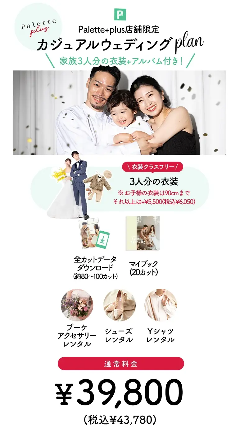 *お衣装:パパママそれぞれ洋装1着ずつ、お子様洋装1着(kids衣装は1着につきレンタル料6,050頂戴致します)