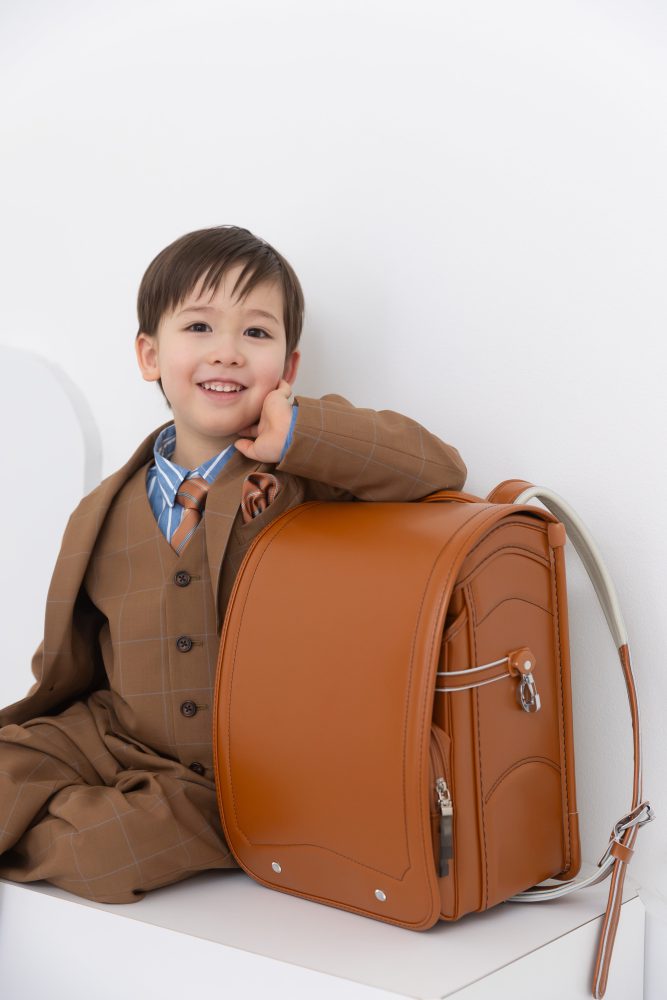 淡いベージュの入学衣装にキャメルカラーのランドセルの組み合わせ。