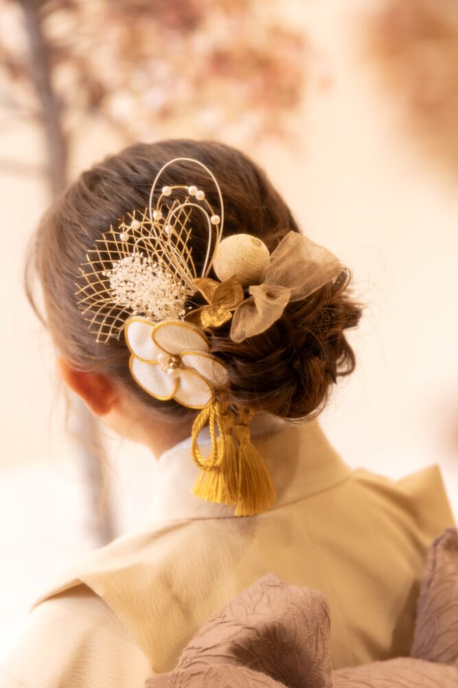 ヘアも王道和装にピッタリなまとめ髪にたっぷりの髪飾りで豪華に。