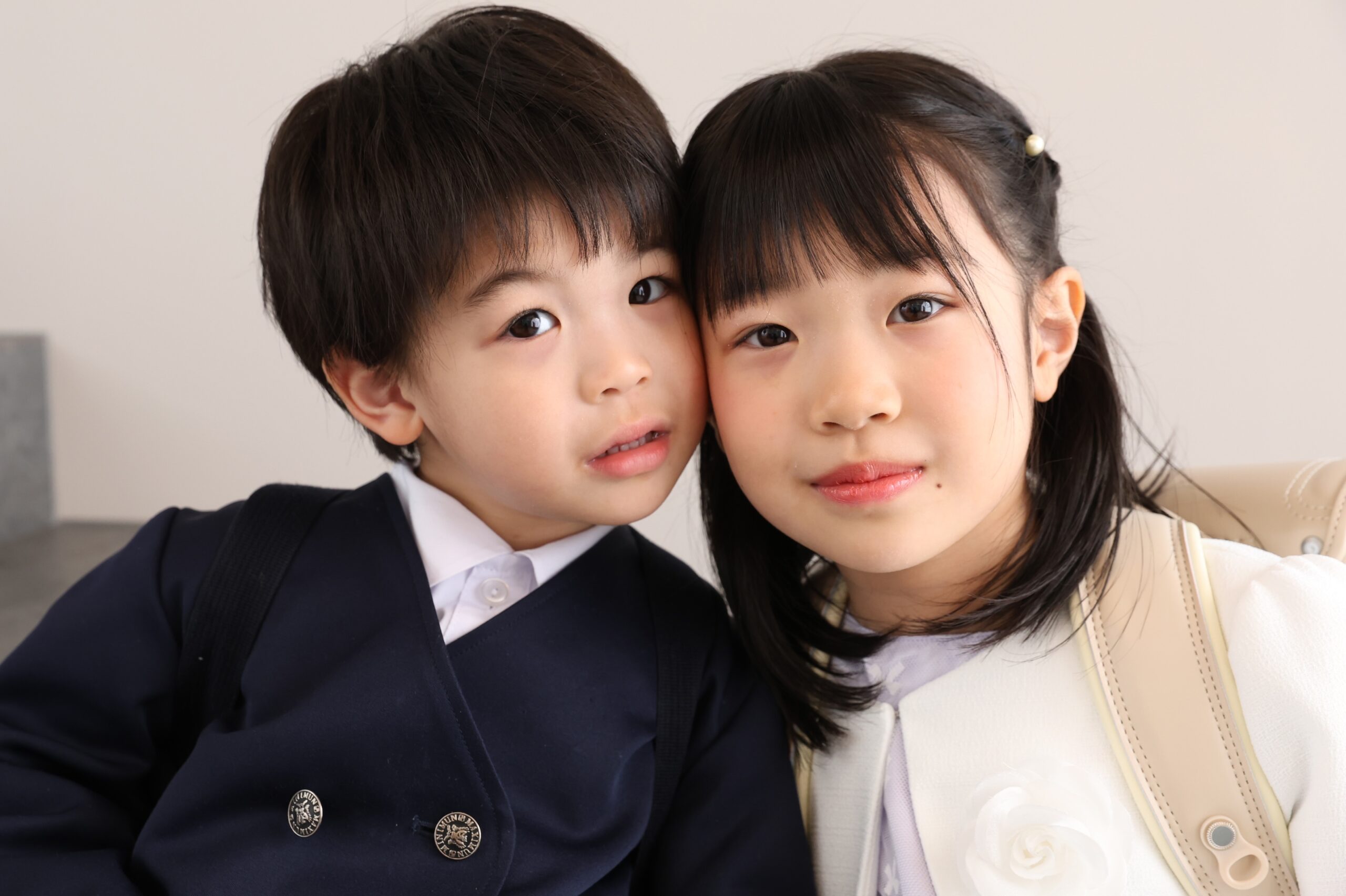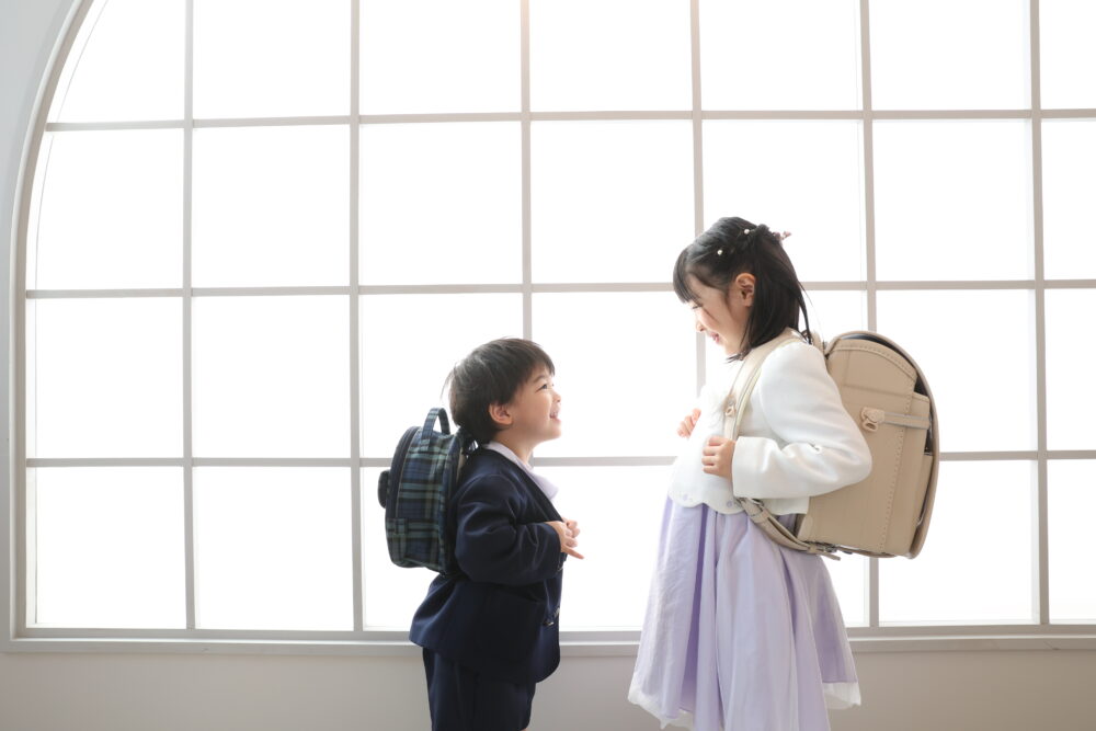 「おめでとう」が響き合うペアカット: 「今日から一緒に、学校(園)頑張ろうね!」と手をつないだり、背中を合わせたり♡ 一人での緊張が、二人なら「楽しさ」に変わる魔法の瞬間です🎞️
