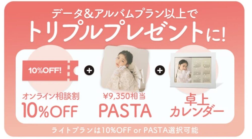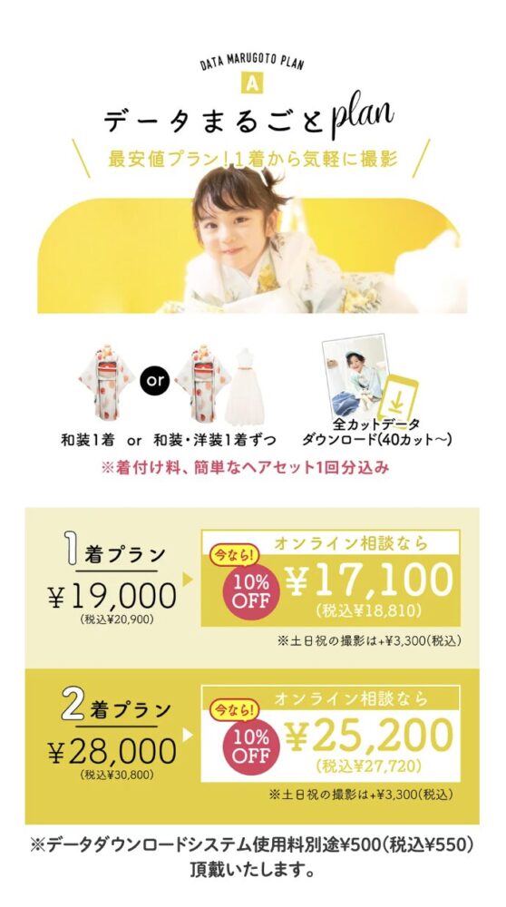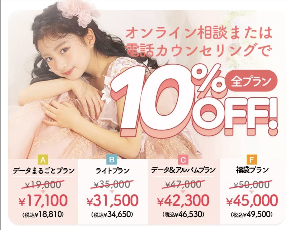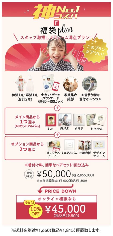 1着から気軽に撮影できるプランから、オプション商品や家族撮影がセットになったお得なプランまで、お客様のお希望に合わせたプランをご紹介可能です!プランはまだまだあるので残りはぜひオンライン相談で!🫶🏻