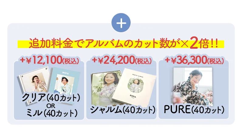 プラン内アルバムだと全20カットの「マイブックアルバム」ですが、追加料金で「40カット収容アルバム」への変更も可能!