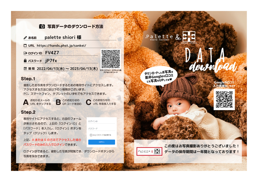 ぱれっとで撮影が終わったお客様にはこちらの用紙をお渡しします。
