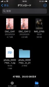 “zip”フォルダをタップすると展開されて”一括ダウンロード”したお写真が1つのフォルダの中に入って出て来ます。