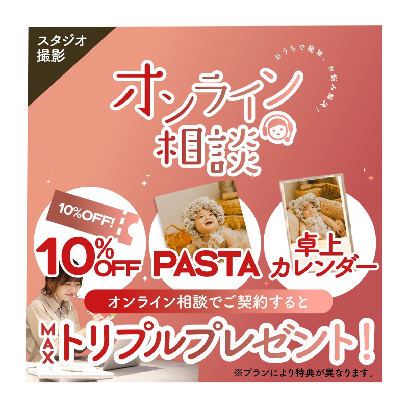 こんにちは!ぱれっと帯広店です! 今月のキャンペーン情報を紹介しちゃいます! 1月はオンライン相談で選べる特典となります!!! 撮影をお考えの方は今がお得ですよ★