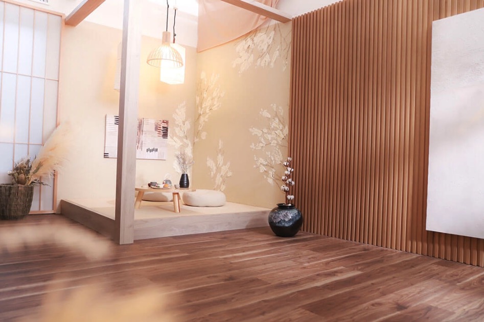 小上がりとD字窓でデザインされた床の間。本物の竹を使ったデザイン壁がモダンさを引き出しています。